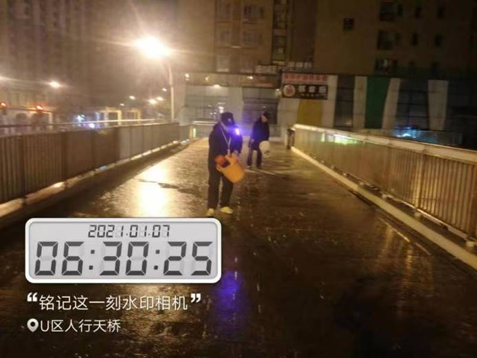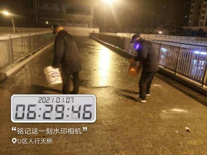 根据照片中时间时间信息水印,小编才得知,原来早在1月7日的凌晨6:30分左右的时候,宏立城集团物业的秩序员们就已经开始出现在各个区域的天桥、路面等区域进行撒盐除凝的作业。