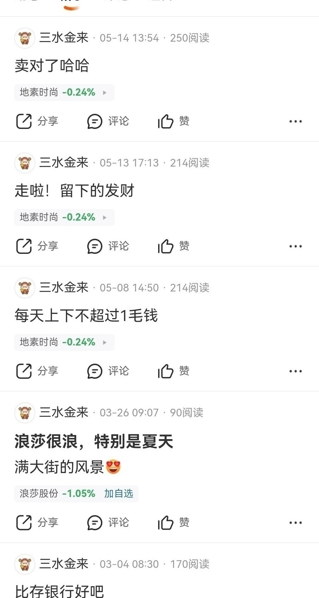 $东财可转债纺织服装指数(ZT881003)$ $地素时尚(SH603587)$ 季线底部周线上涨趋势,短线今年翻倍,中长线十倍涨幅以上,卖在季线底部十元左右底部唱空破坏投资环境没有意义,河北ip三水金来没必要用光芒万丈出来捣乱,坚决抵制打击这种行为