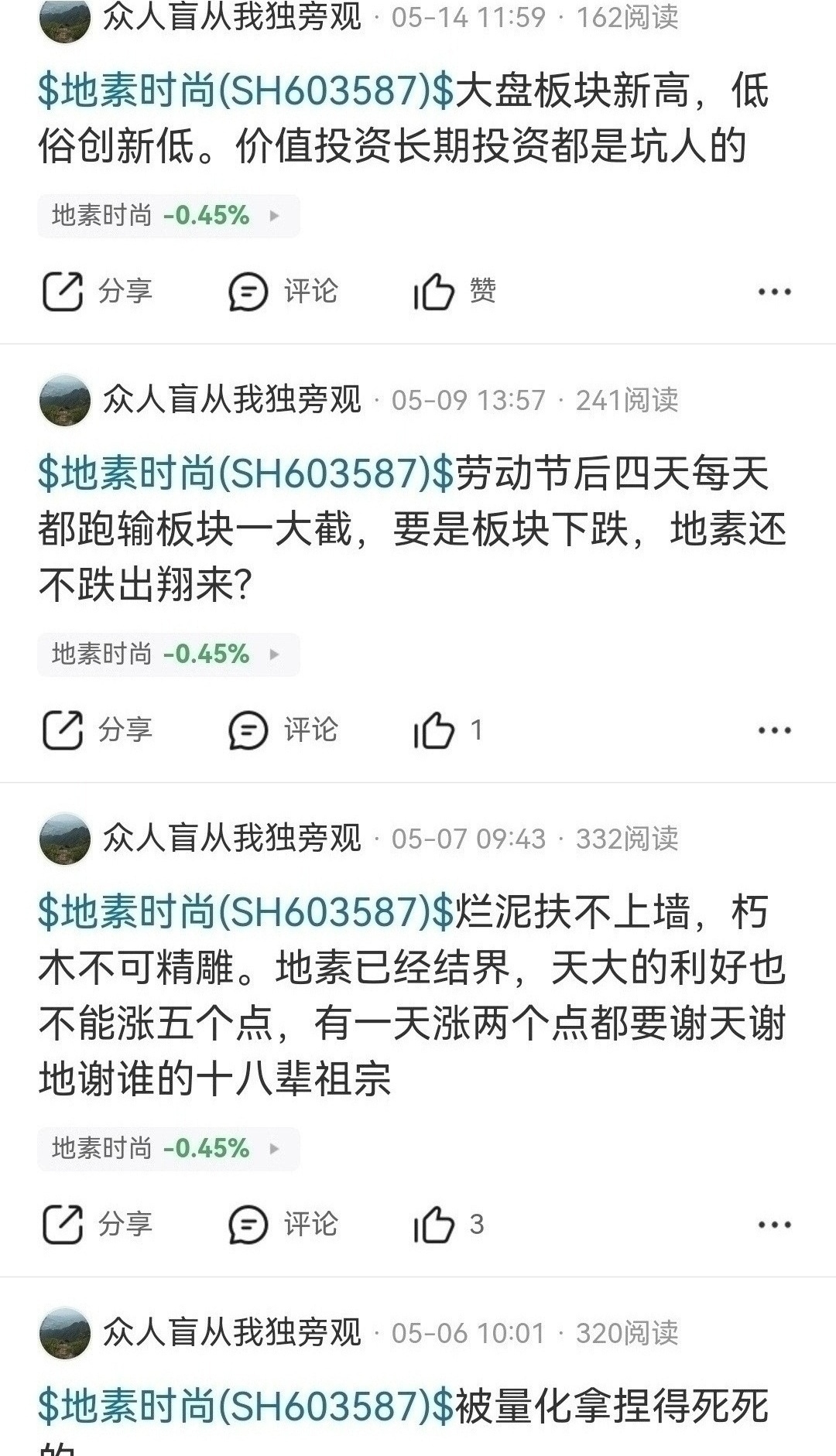 $东财可转债纺织服装指数(ZT881003)$ $地素时尚(SH603587)$ 首发经济谷子经济龙头,服装板块小市值股票先涨,平均市盈率六十倍,女装龙头,三十倍估值百亿市值依旧低估,六十倍估值才回归价值,中长线季线底部至少几倍涨幅。卖在季线底部十元附近唱空攻击人的资金最后买入机会,北向资金入场,扩内需消费升级再通胀预期,消费股中长线上涨趋势