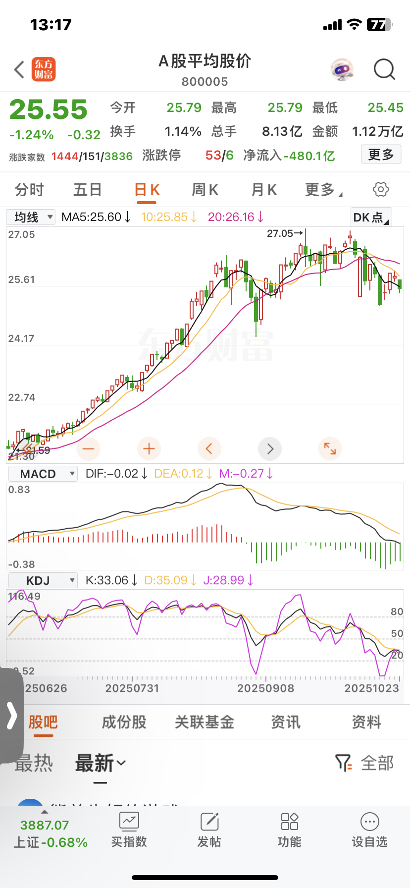 平均股价指数大型圆弧顶锅盖顶雏形,如果上周五阴线低点25.14元撑不住的话就可能要去9月4日颈线位24.37元了,如果跌到那个位置可能是下个月也就是年内最后一个反弹了,如果还没量就还是难以突破箱体上沿了,那基本上就要春节前挖出大坑再进去玩了。。。