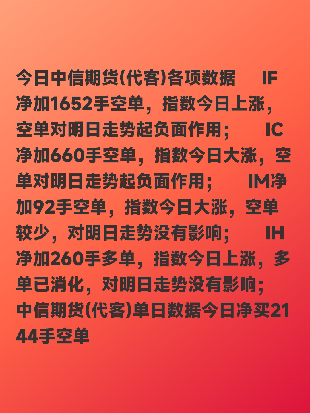 今日中信期货(代客)各项数据IF净加1652手空单,指数今日上涨,空单对明日走势