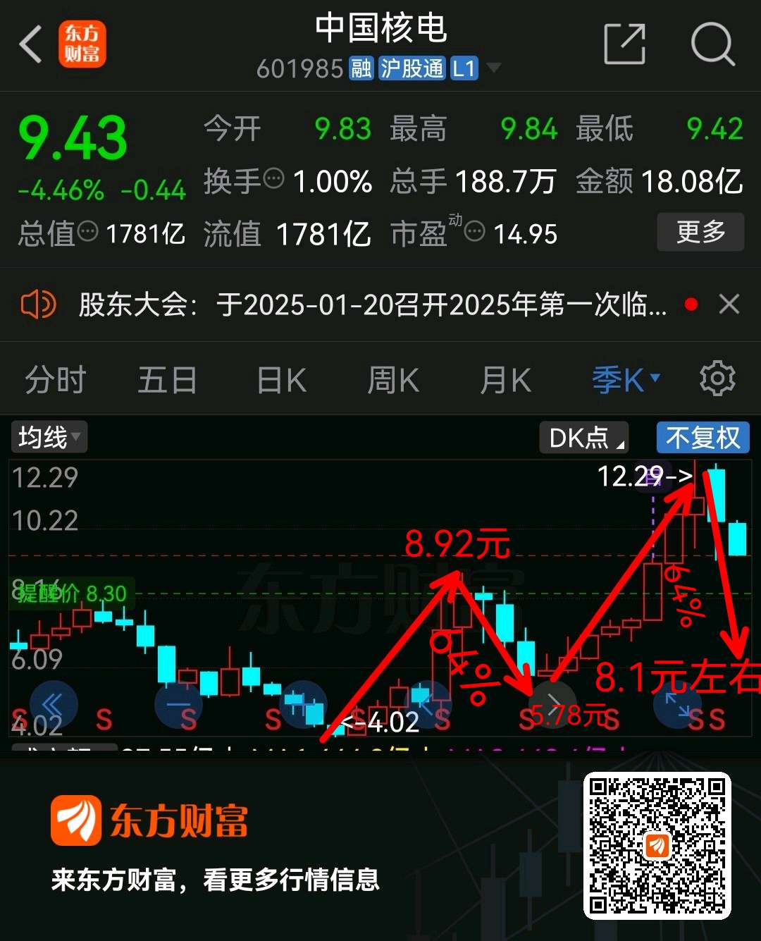 元旦第一个帖子对中国核电判断,今年先回踩9.54元年平台,当时在10.43元,潜台词先逢高减仓卖出来。今天达到9.54元,喜欢的可以低吸点试盘感。如后市有短线反抽,看反抽高度。