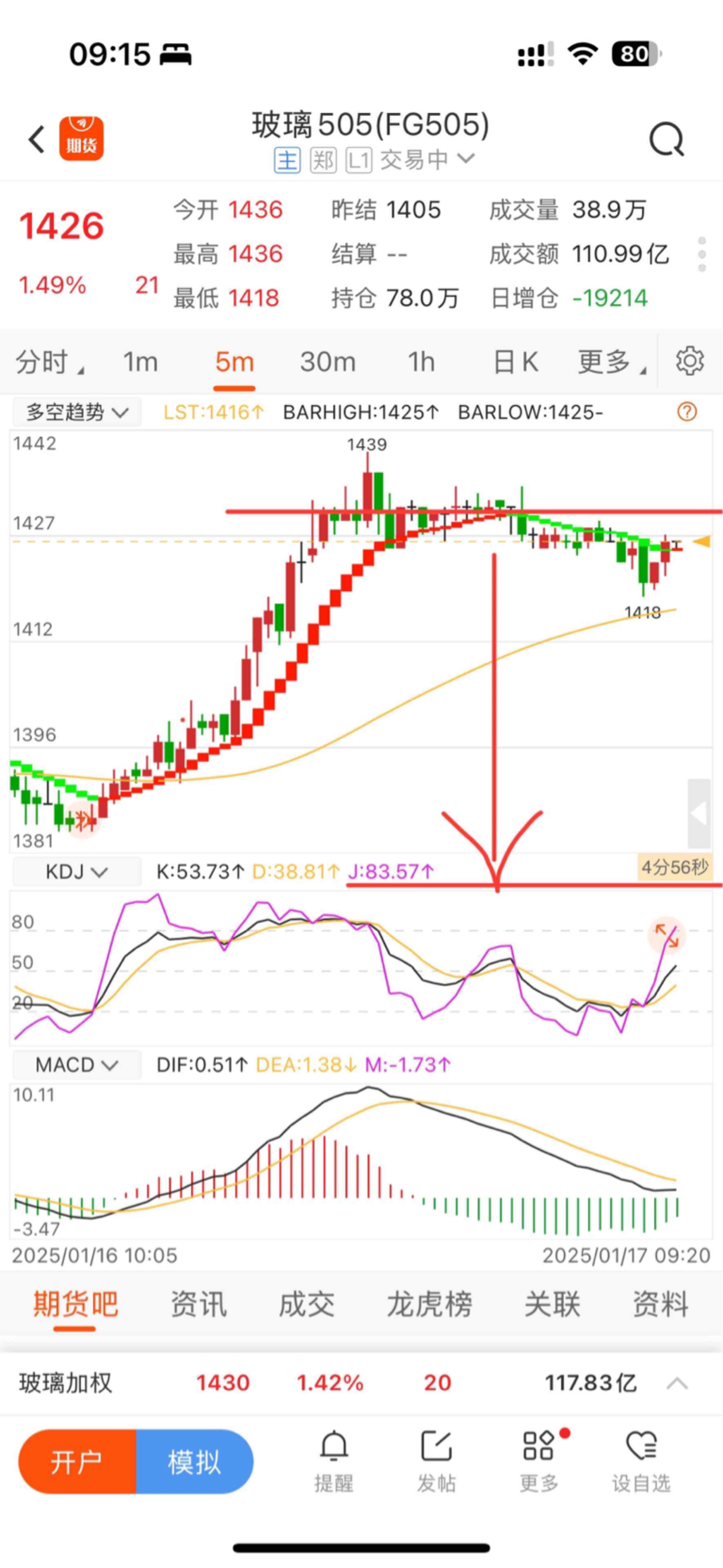 $玻璃505(CZCE|FG505)$ 1425附近做空看回落。止盈价格1360-1380。