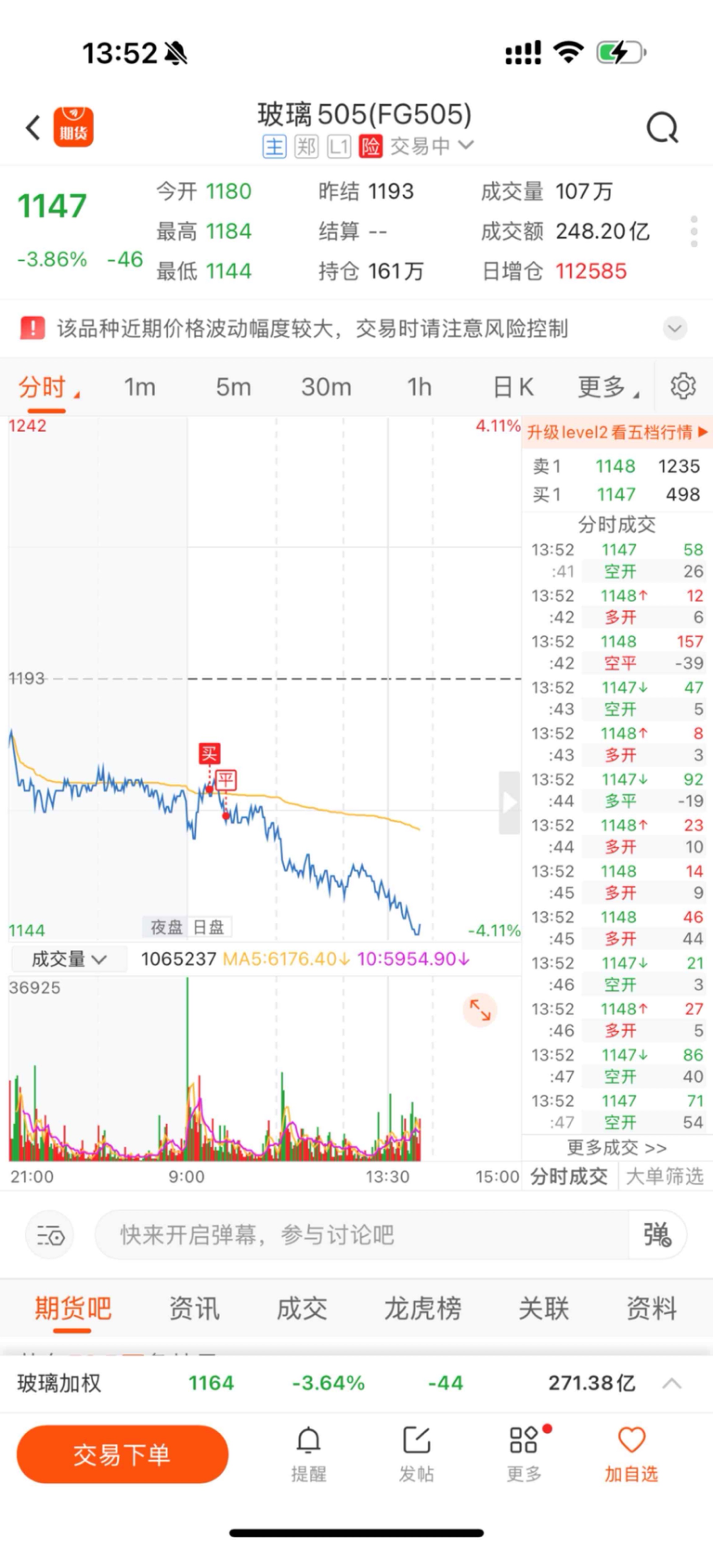 $玻璃505(CZCE|FG505)$ 早上想极限抄底,博反弹,后面情况不对立马割了