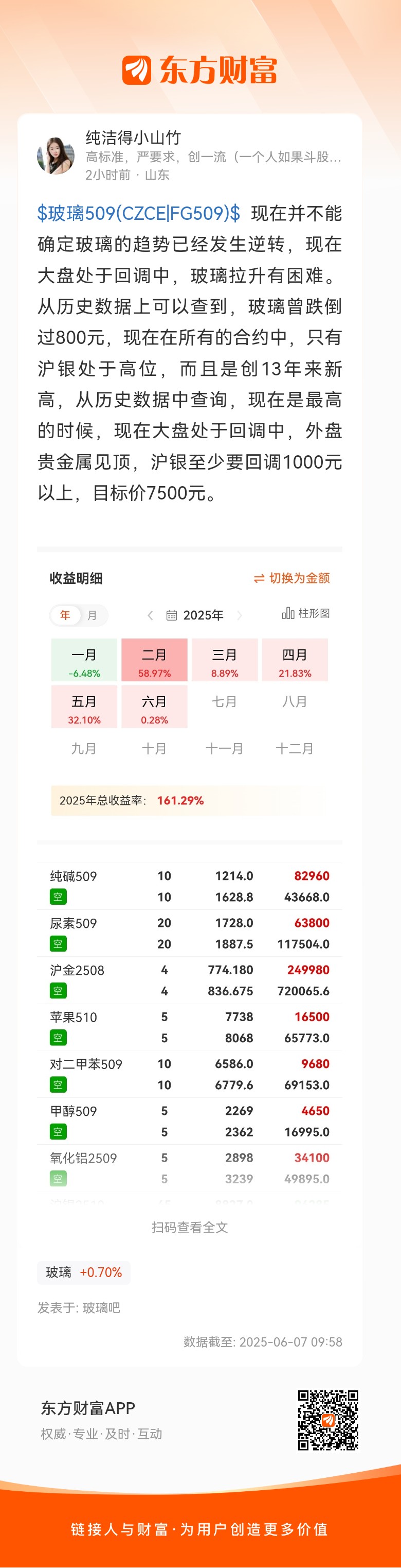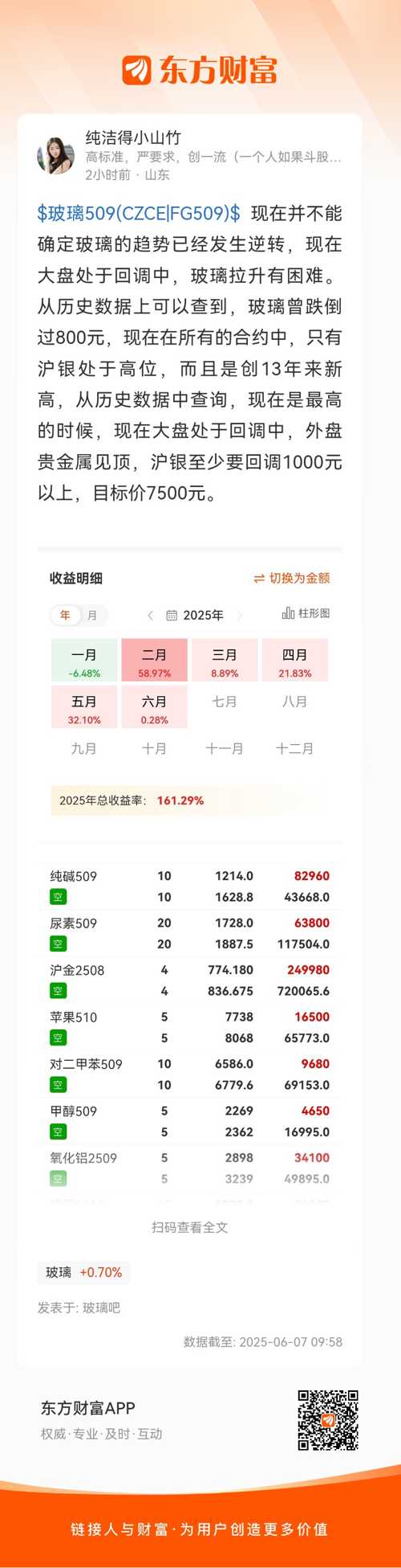 $玻璃509(CZCE|FG509)$ 现在并不能确定玻璃的趋势已经发生逆转,现在大盘处于回调中,玻璃拉升有困难。从历史数据上可以查到,玻璃曾跌倒过800元,现在在所有的合约中,只有沪银处于高位,而且是创13年来新高,从历史数据中查询,现在是最高的时候,现在大盘处于回调中,外盘贵金属见顶,沪银至少要回调1000元以上,目标价7500元。