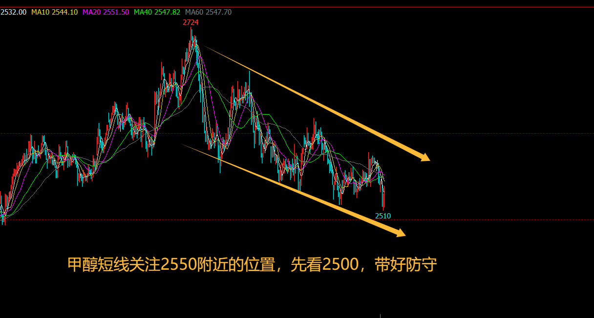 $甲醇505(CZCE|MA505)$ 甲醇05合约:甲醇今日早盘继续创低,跌破前一波低点2517一线支撑,从小时级别来看甲醇逐步创低,重心下移,弱势格局不变,后市大概率继续延续回落走势,建议短线反弹做空为主导,短线关注2550附近的位置,先看2500,带好防守(投资建议 仅供参考 具体以实盘操作为主)
