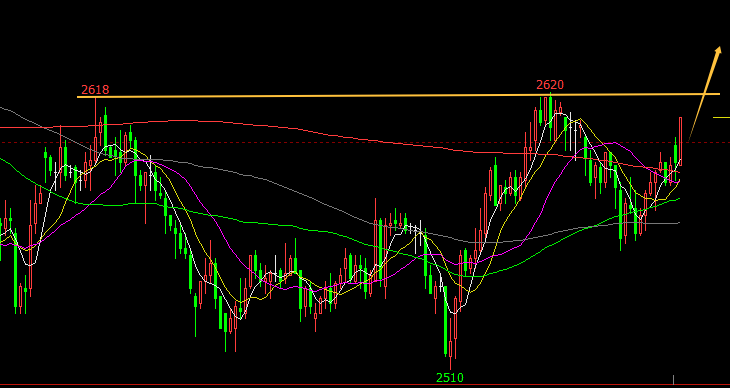 周五晚上已经在动了,小时图来看,首先支撑位在2600,关键的一击是上面2620的平台,如果继续增仓拉,那就准备做突破行情,这个级别的突破,就做一波短平快的行情,也就是说,突破后,止损跟着上移,可能当天能结合的大空间