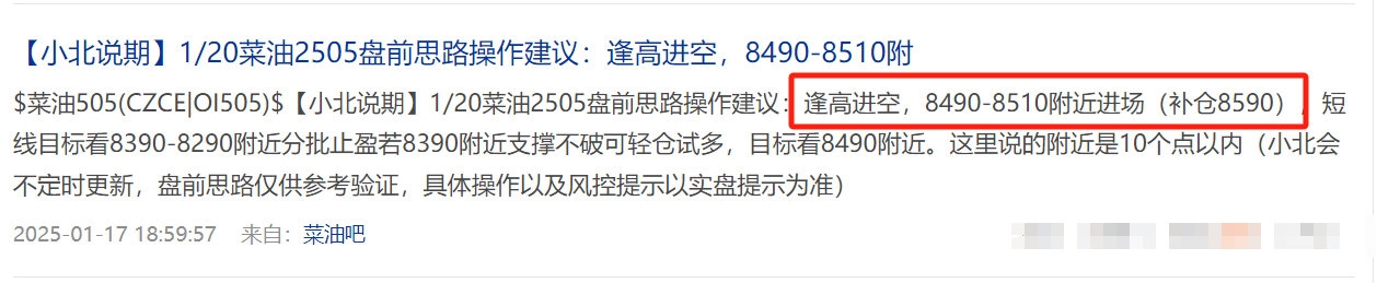 $菜油505(CZCE|OI505)$ 菜油空单兑现80点,1.20盘前给的思路是8510附近进场空单,今天盘中最低触及8423。(小北会不定时更新,盘前思路仅供参考验证,具体操作以及风控提示以实盘提示为准)