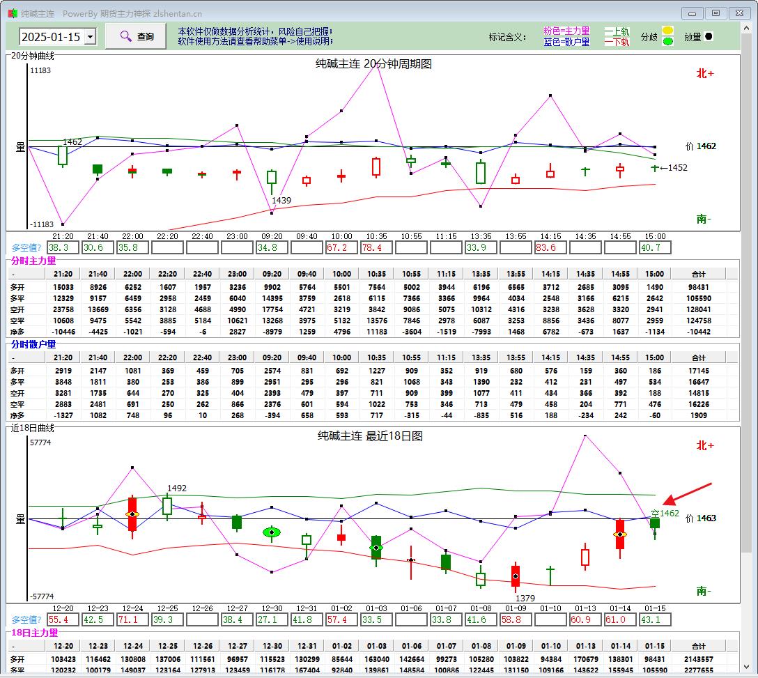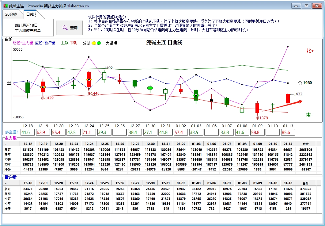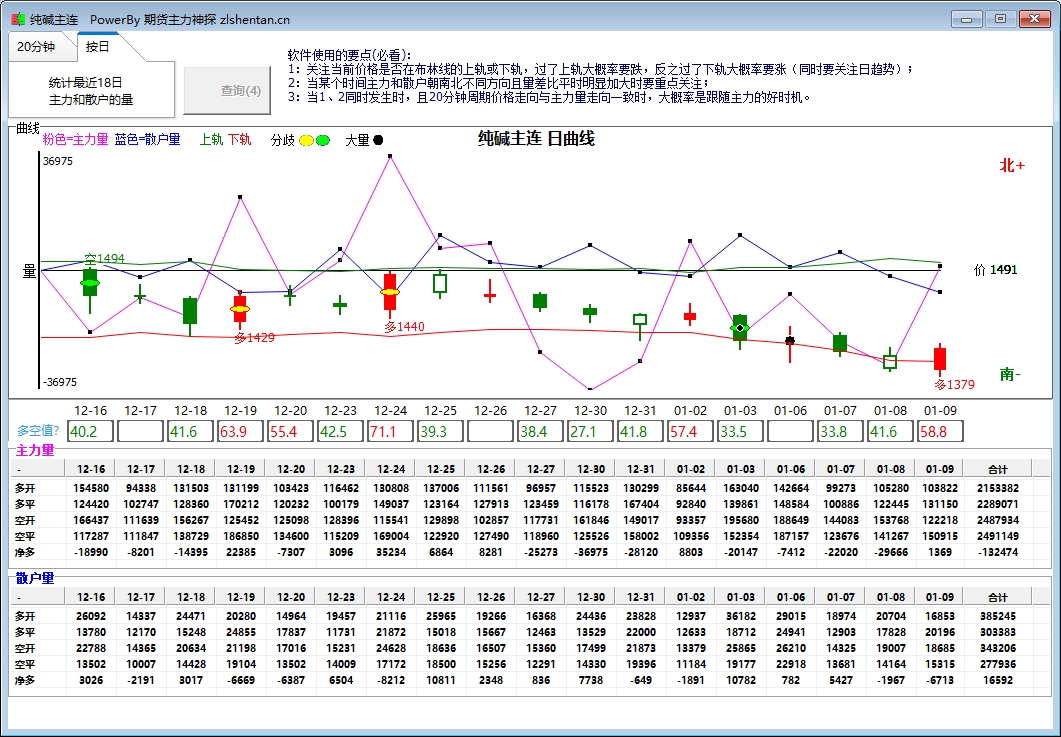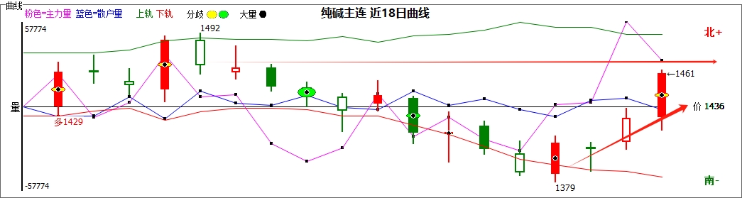 9日,纯碱发出多的信号,因为从统计数据看,散户在这里放量做空6713手,必须套住散户。