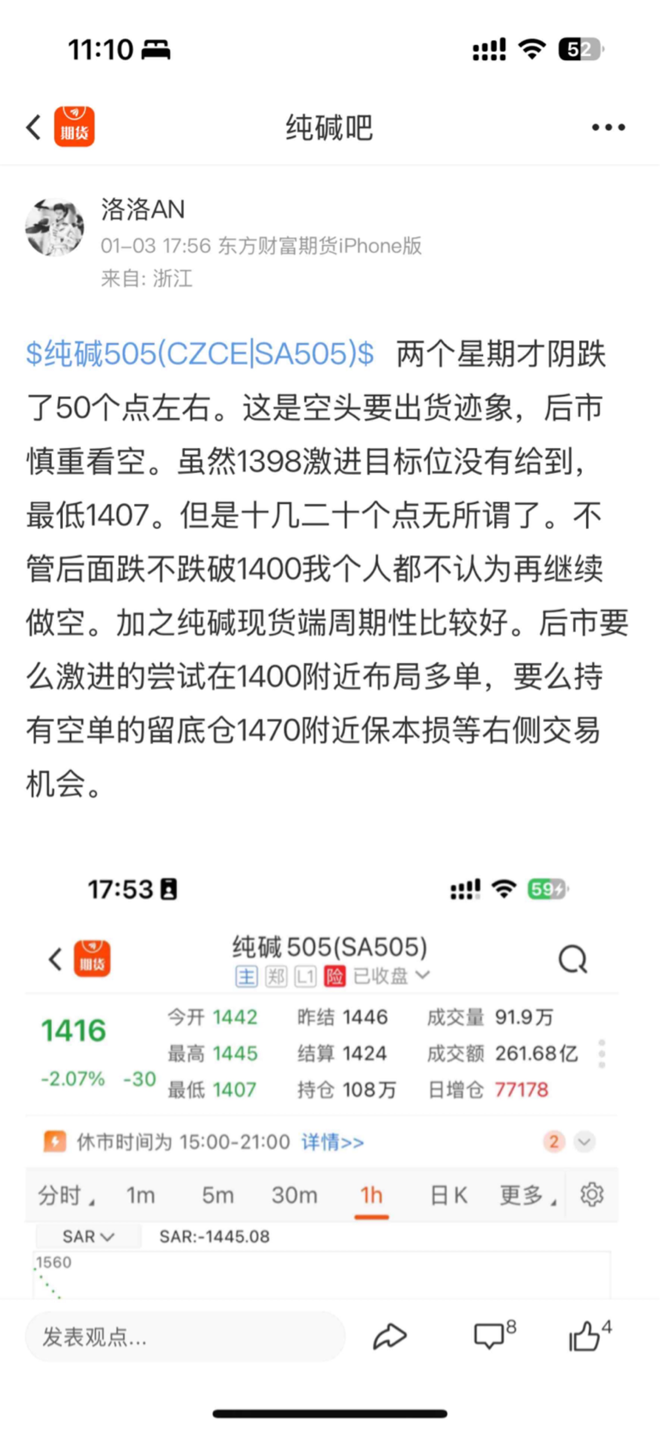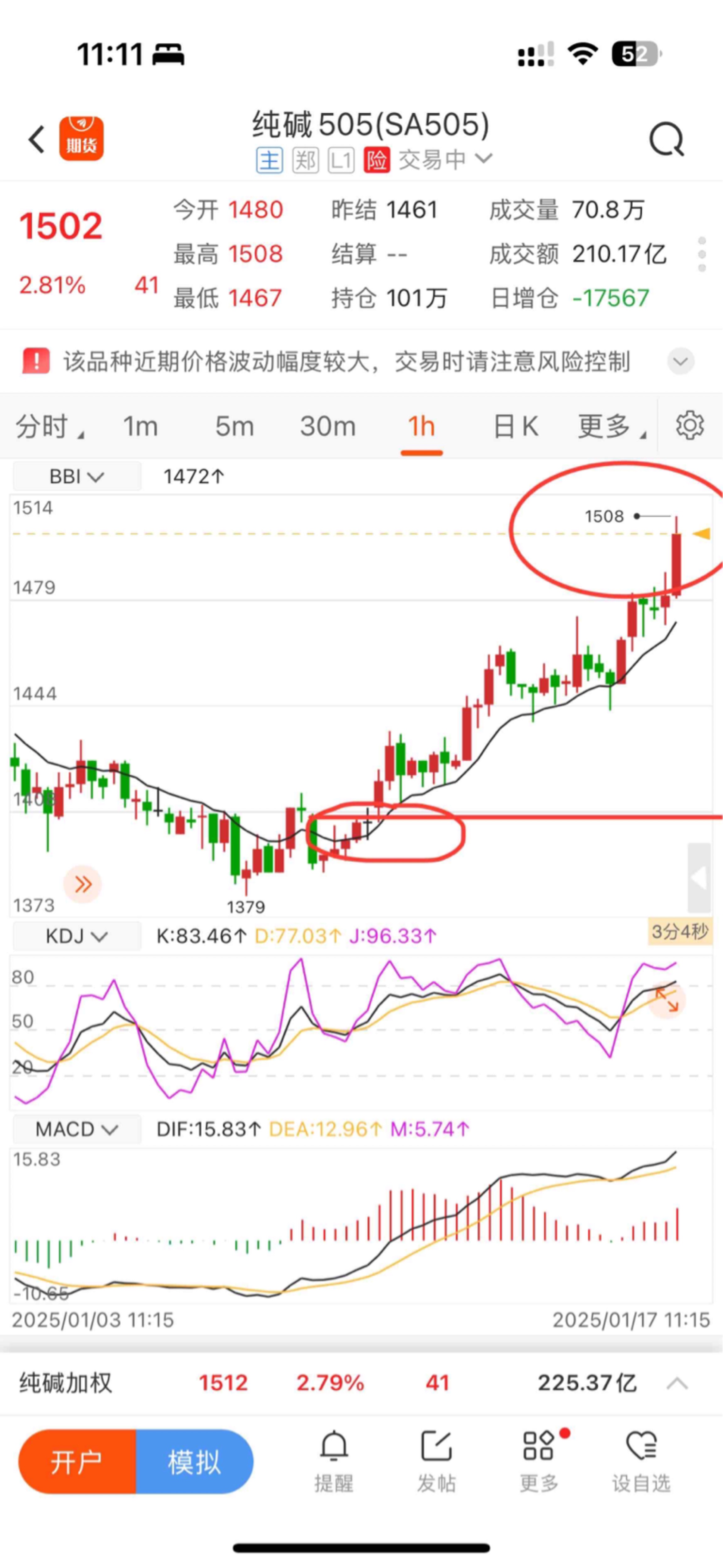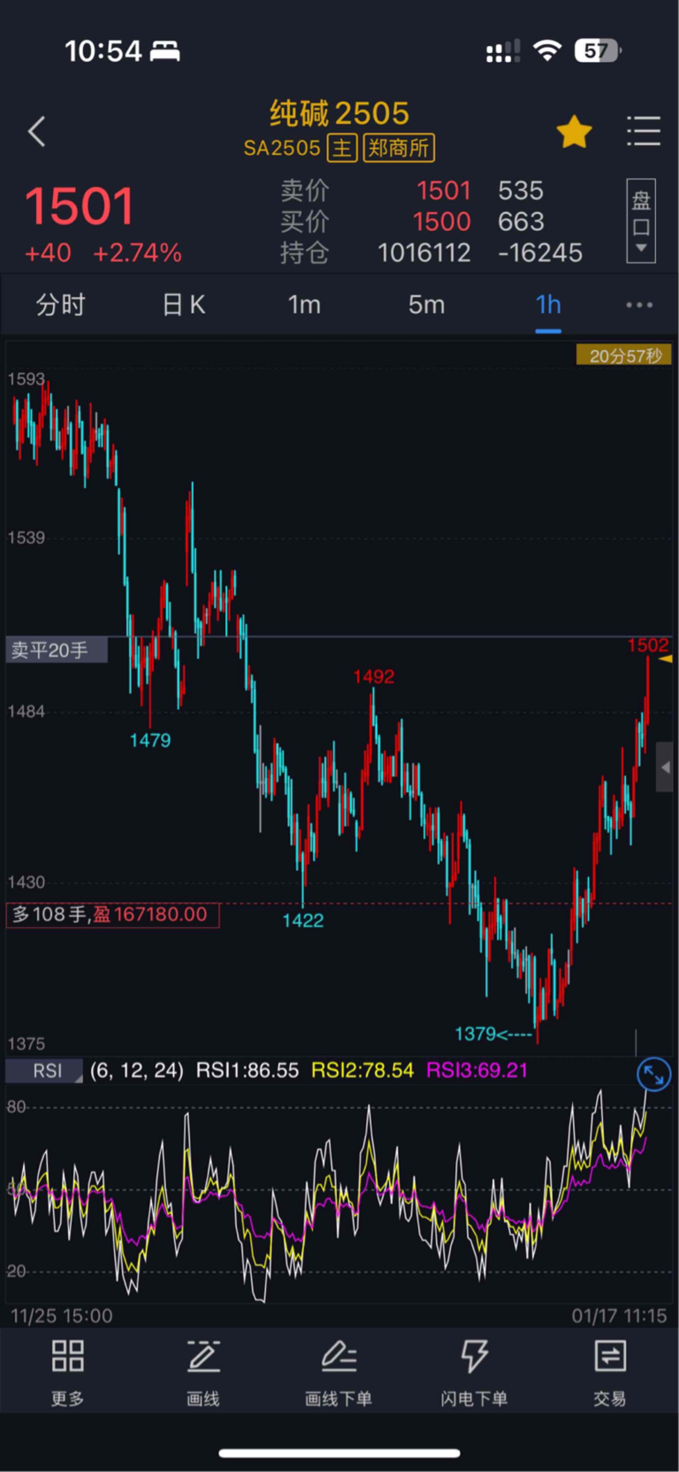 $纯碱505(CZCE|SA505)$ 1508终于到咯。我从1408开始做多,后来最低1379。刚开始企稳,1420上方的那天我就挂单止盈位1508,每天都在挂单都没有给到。今天给到了