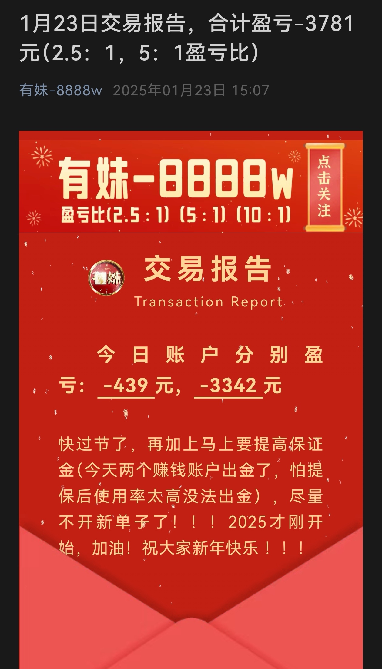 1月23日交易报告,合计盈亏-3781元(2.5:1,5:1盈亏比)