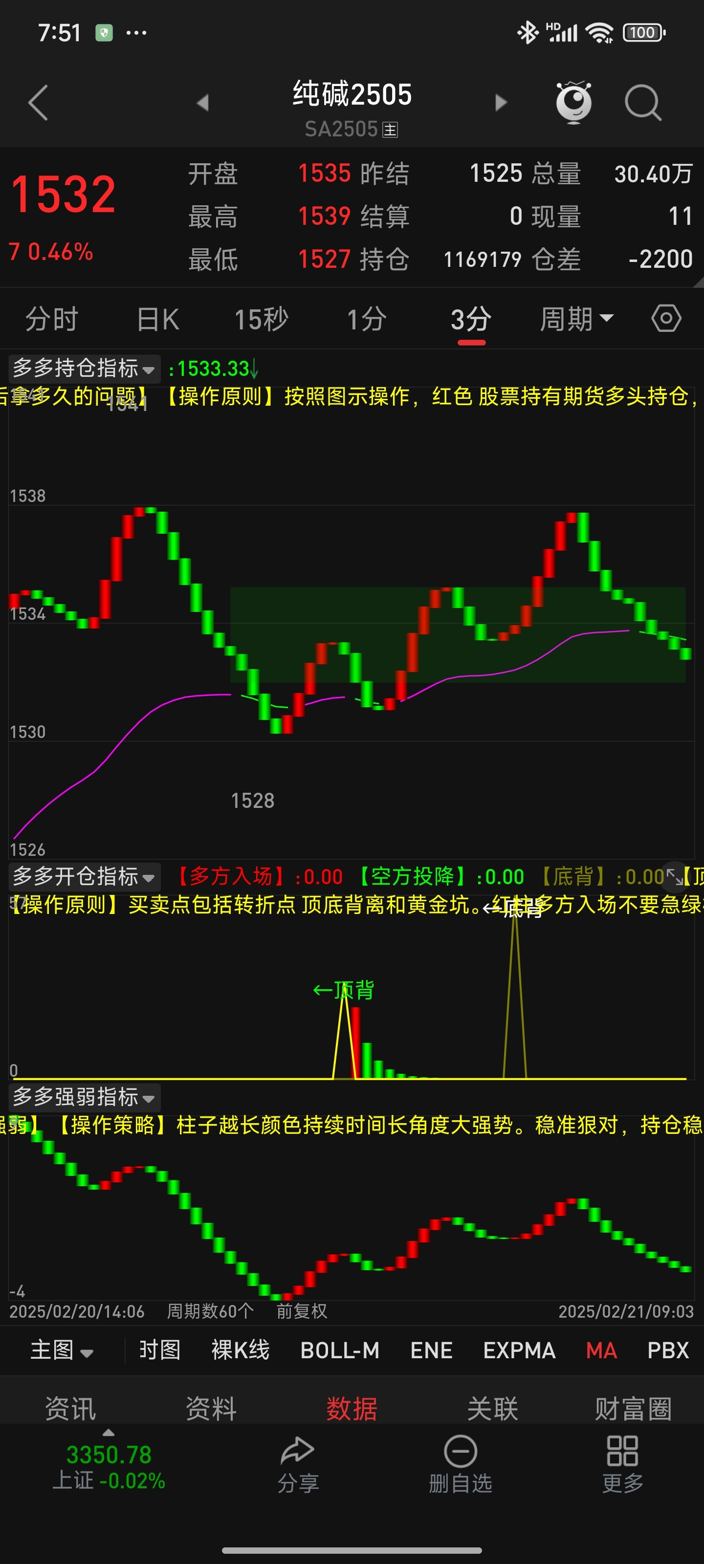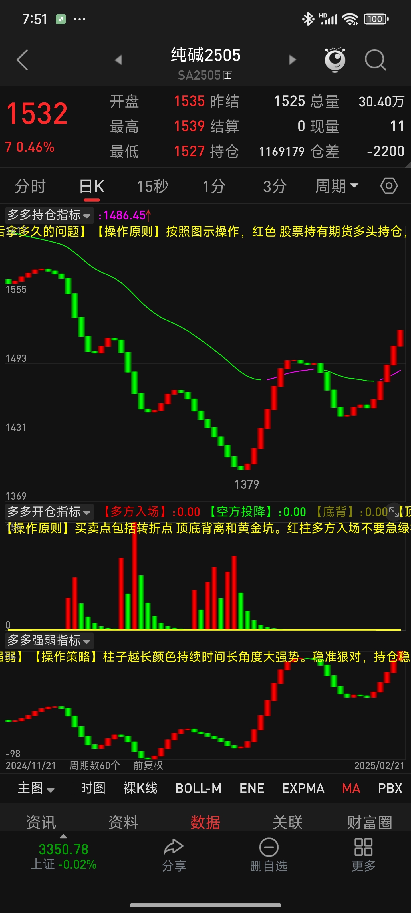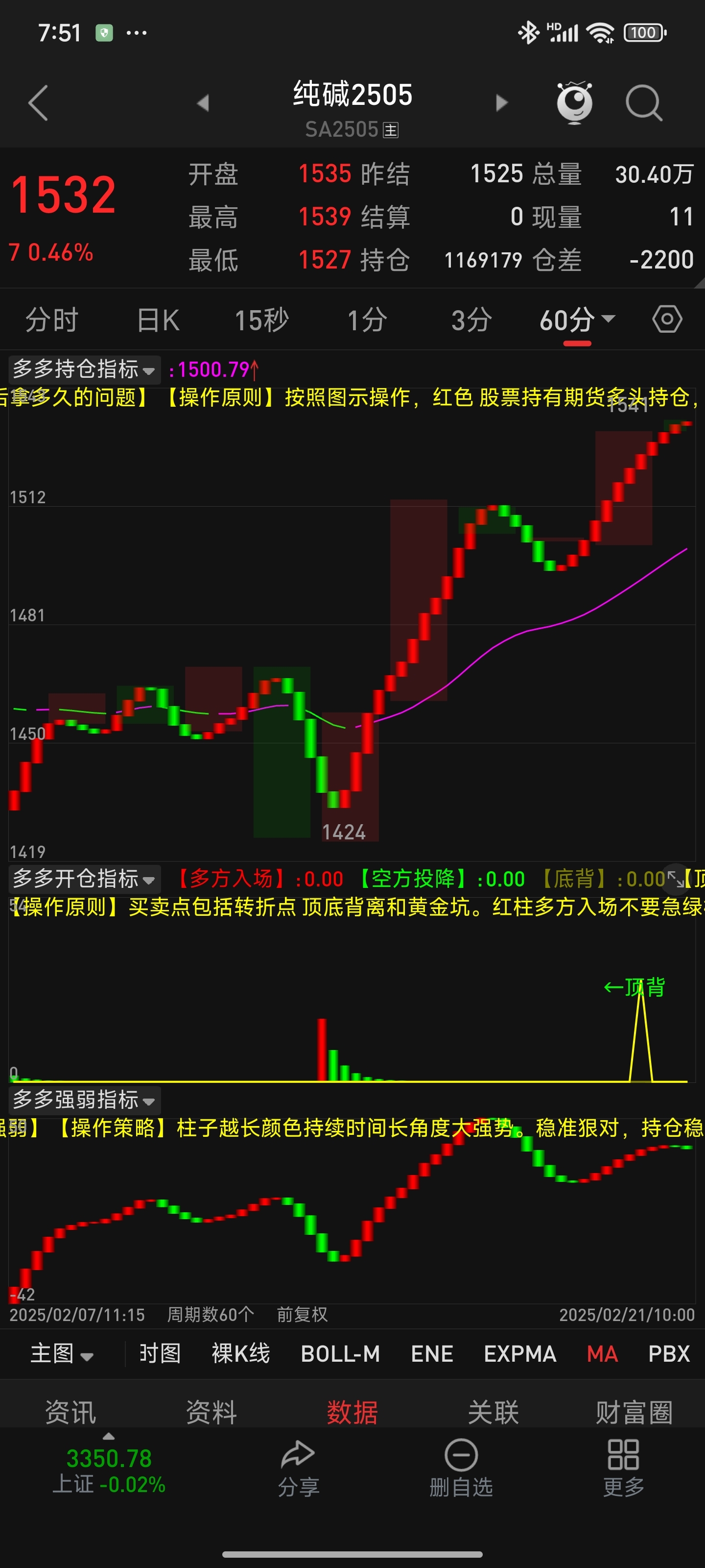 $纯碱505(CZCE|SA505)$ 期货一定可以预判未来。纯碱日线红柱继续强势,按照斐波拉指数3/5/8/13/21计数,现在五个红柱最少还有3根,60分钟走弱红柱变短,13根还有1-2根。可能50后回踩3个绿柱再上,重要点位08/33/50/77/94.