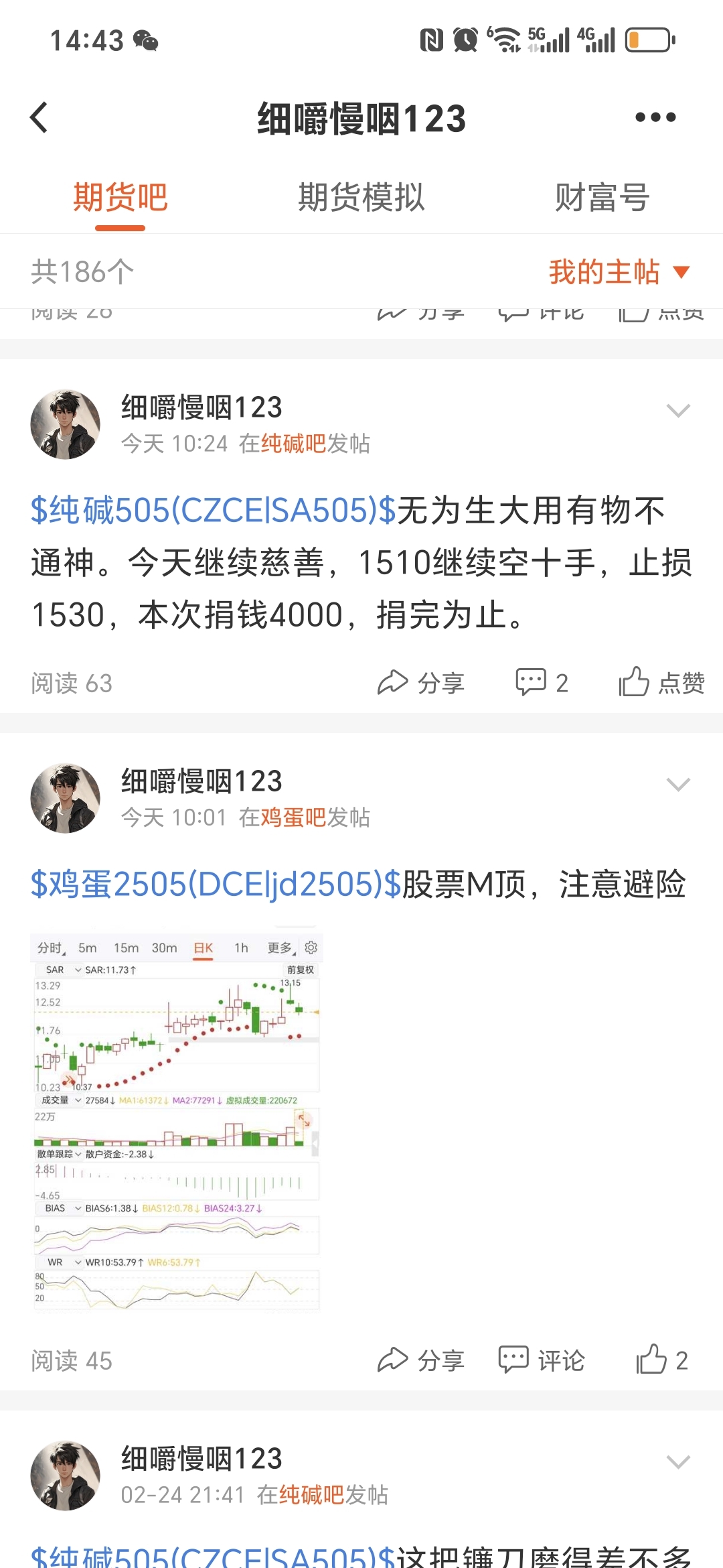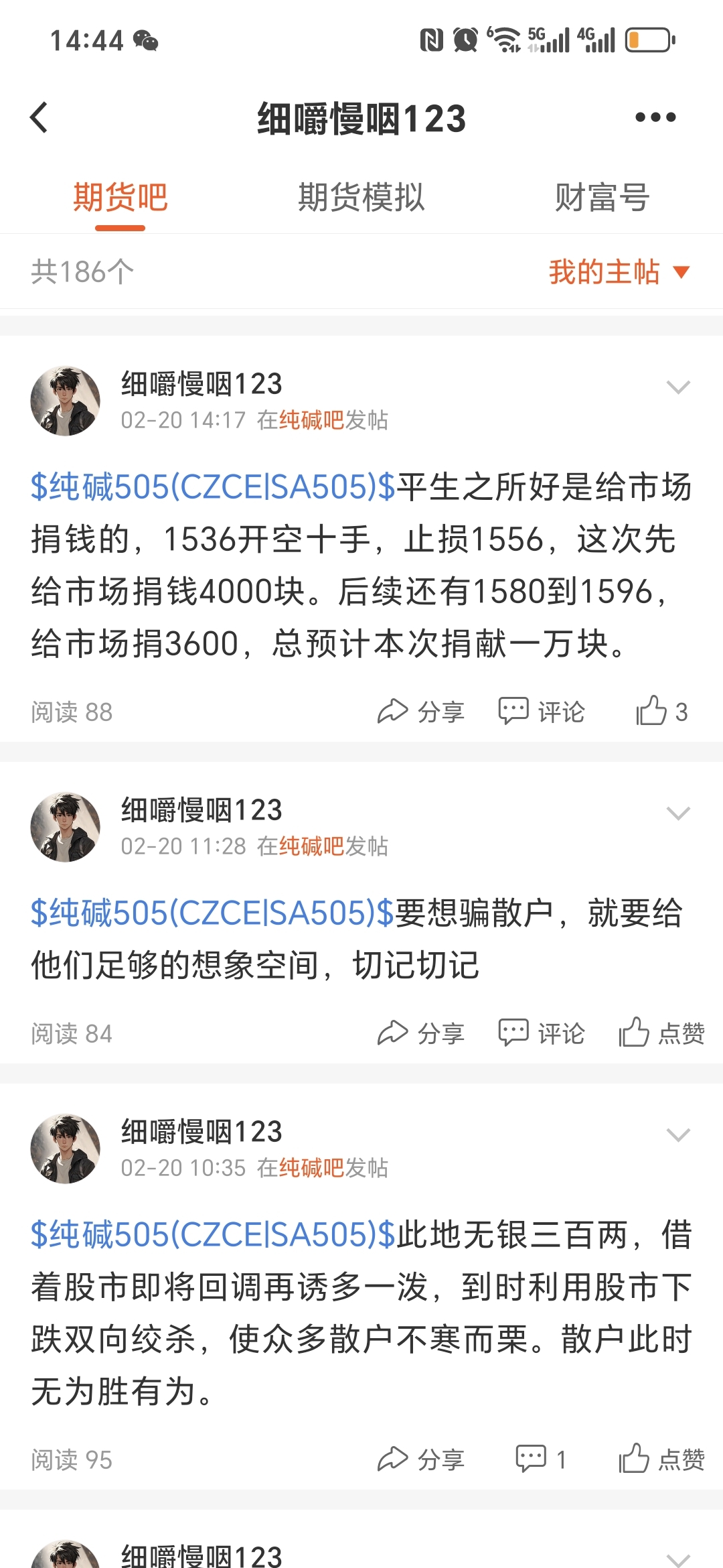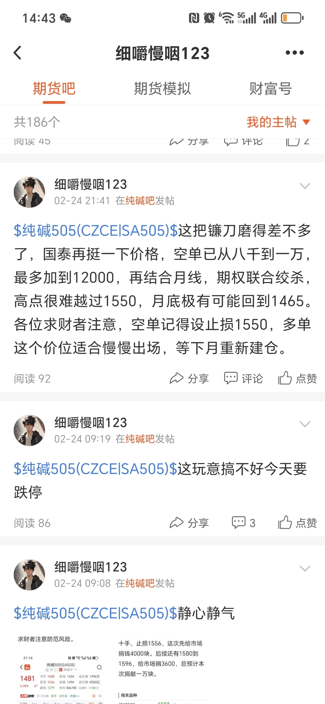 $纯碱505(CZCE|SA505)$ 无为生大用,有物不通神。平生之爱好众多,唯独贪小便宜这毛病难改,为此继续向市场捐钱,本次1500加空30手,止损1520,预亏12000,祝各位求财者收入囊中。