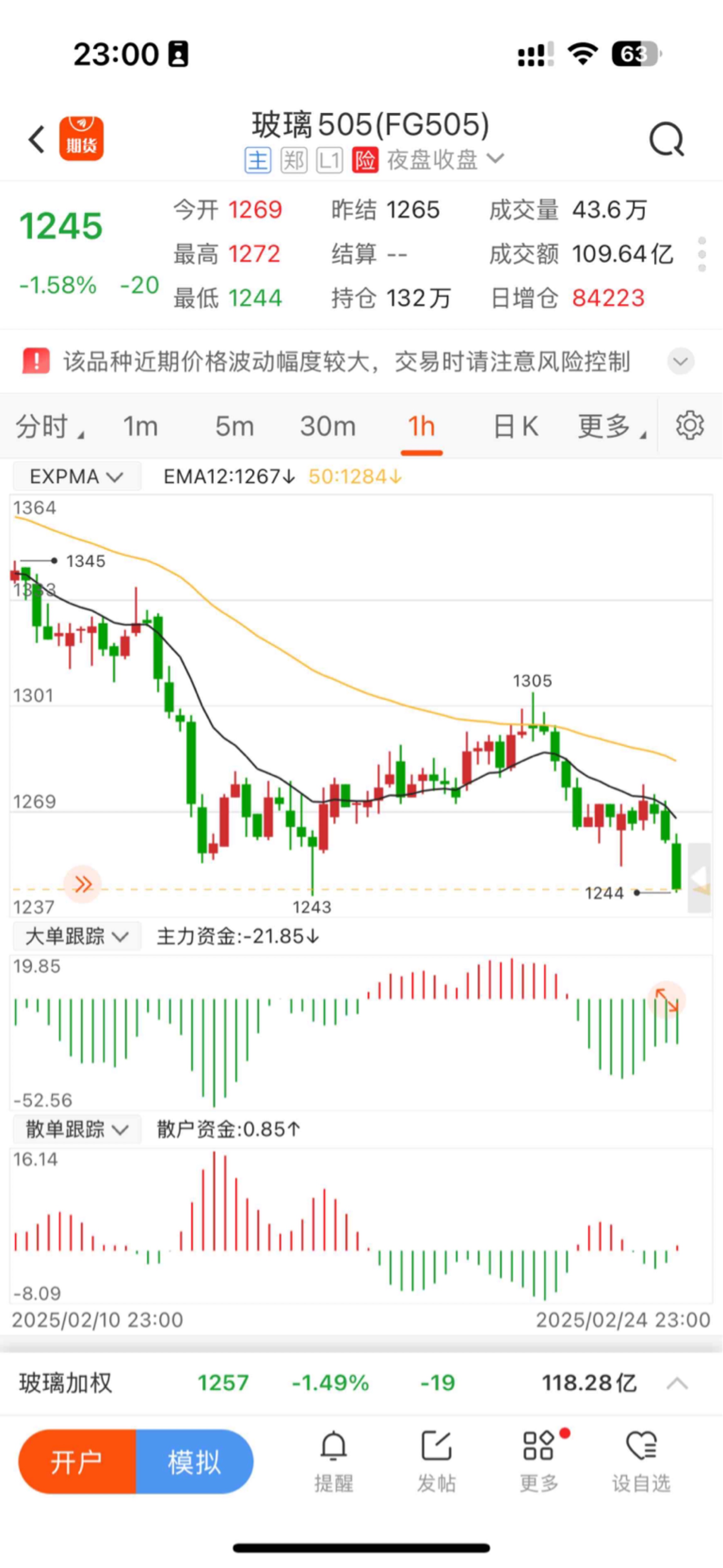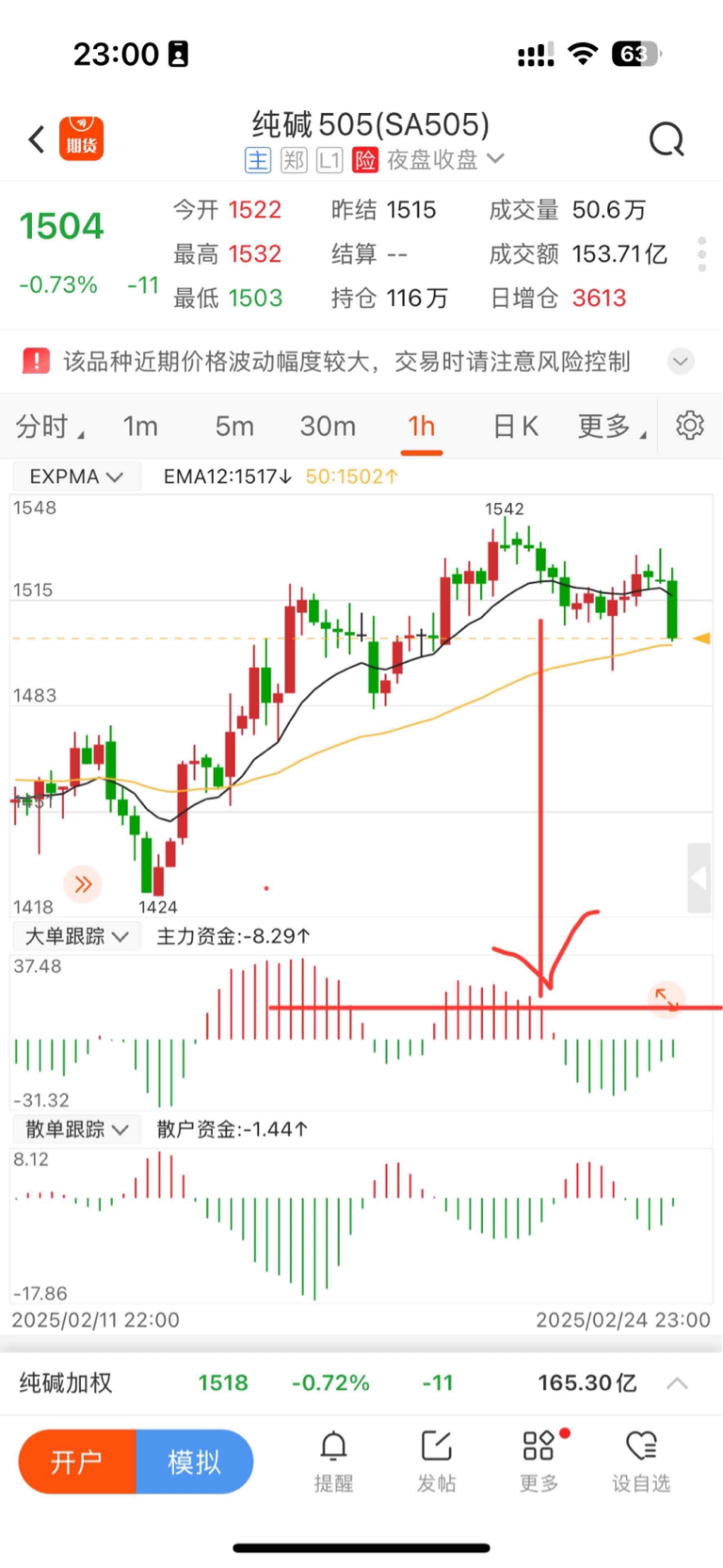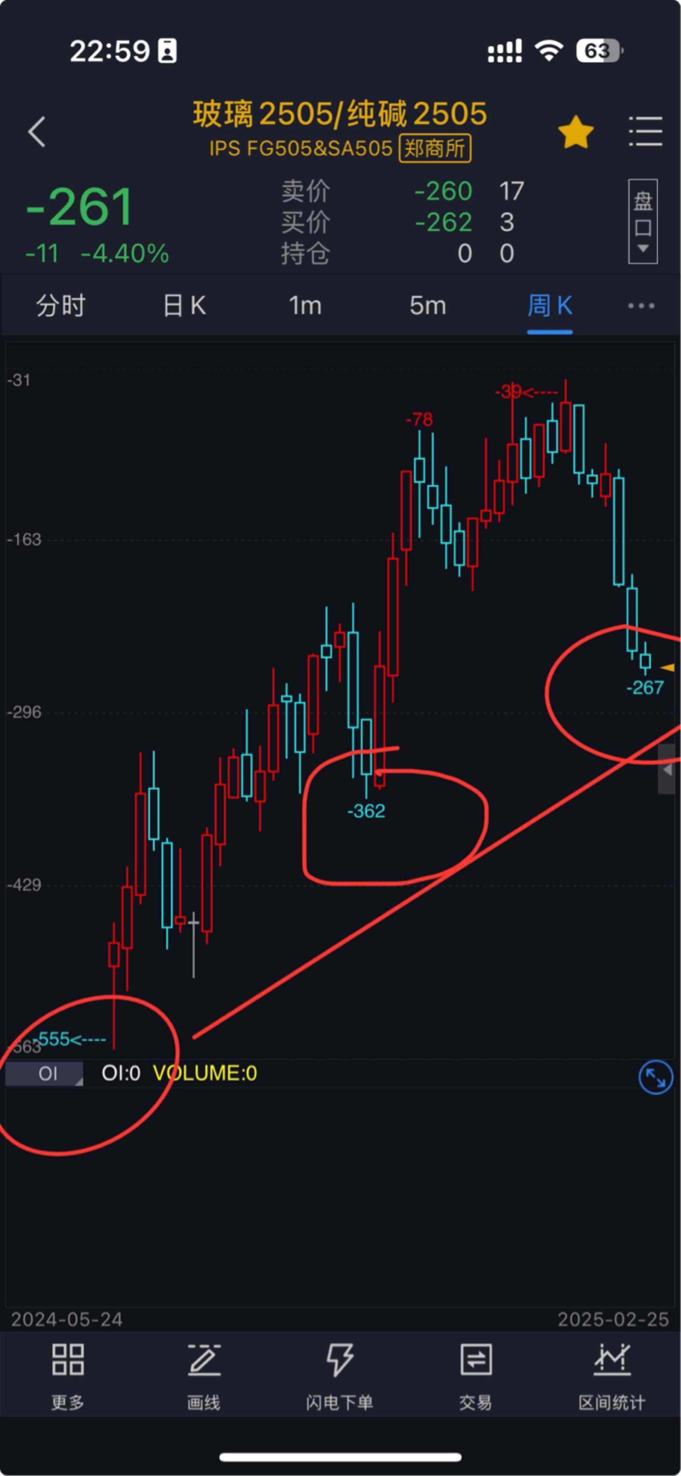 $纯碱505(CZCE|SA505)$ 我还是重复上周观点。虽然套利价差日线级别形成了多纯碱空玻璃反套的样子,但是我之前说过,玻璃纯碱这两个品种但凡有一个还处于下跌通道中,那么大方向一定是多玻璃空纯碱正套趋势并且价差走不远。所以以周线级别为参考就可以了。现在价差-260左右,接下来很有可能会有一笔且最后一笔玻璃纯碱价差再次靠拢,并且以此类推,极大概率会以过去几天1500上方强势震荡的纯碱补跌为主导。因此,纯碱505合约先跌到1250-1300可能性很大。