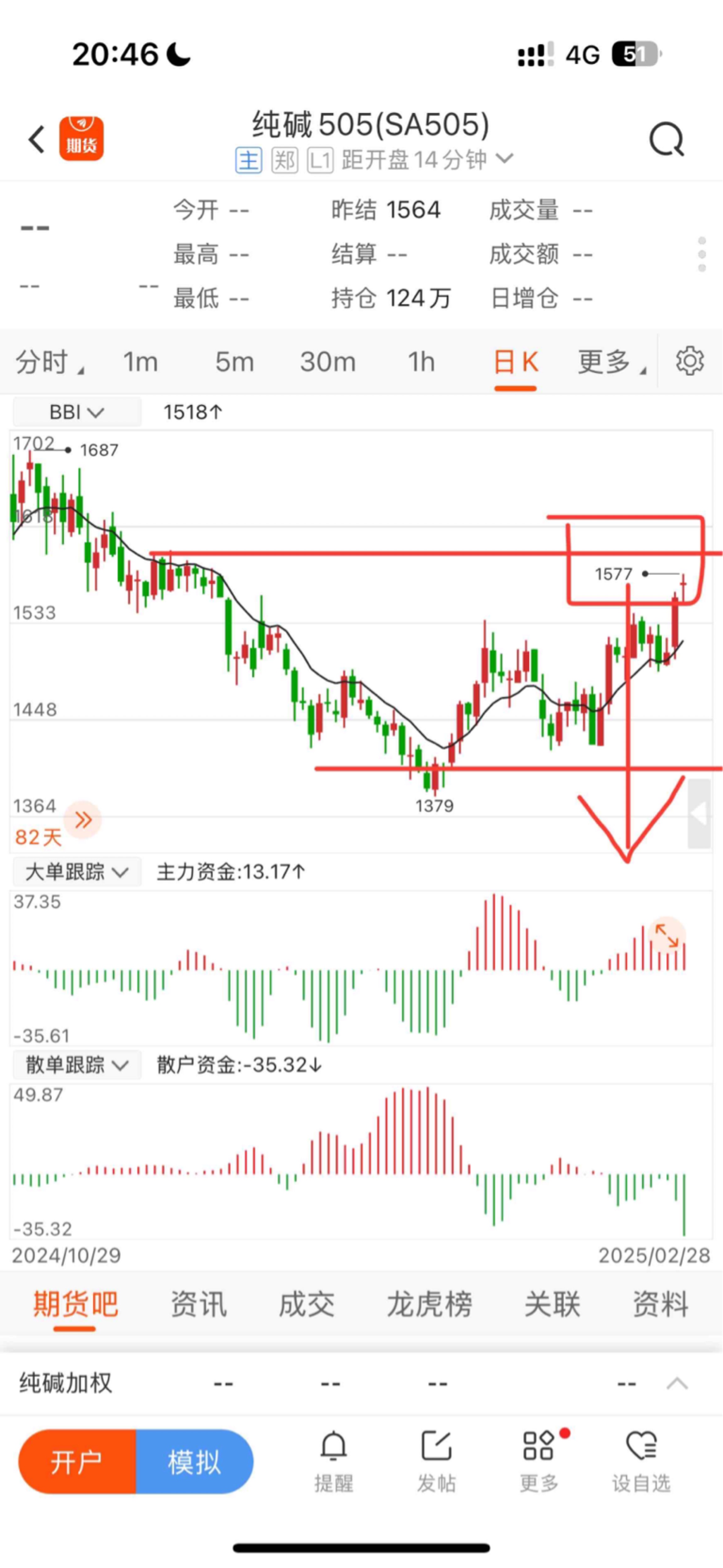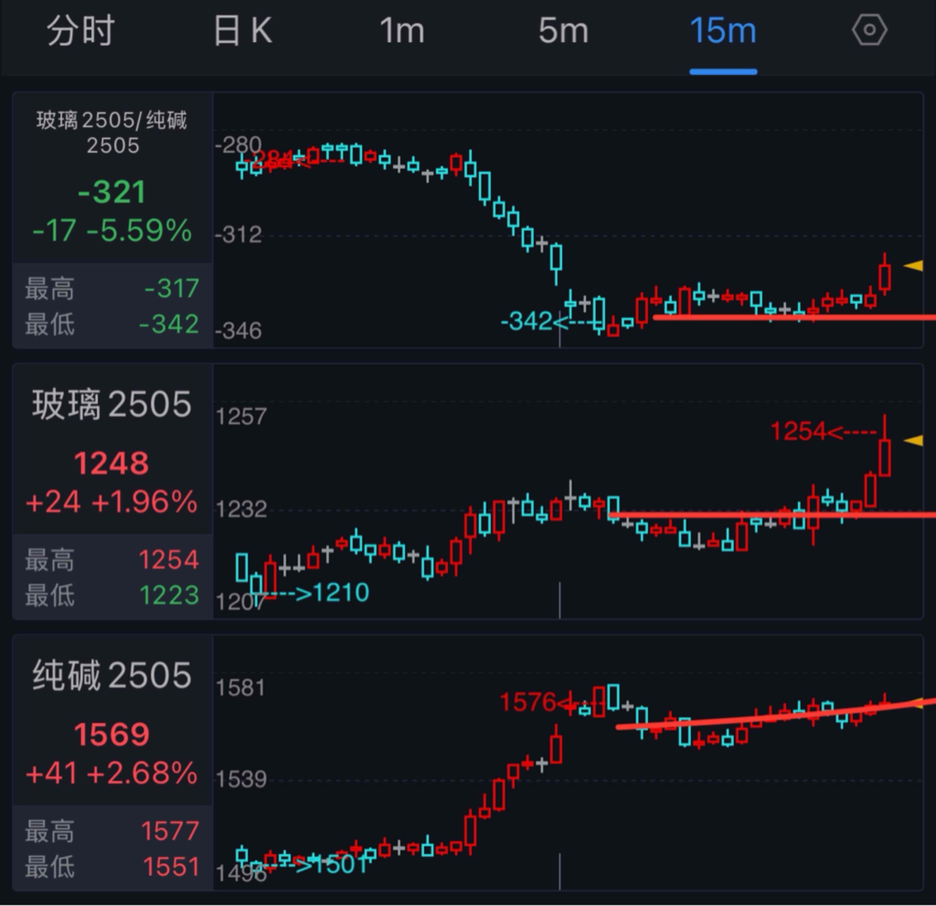 $纯碱505(CZCE|SA505)$ 开盘1570上方做空纯碱继续。现在纯碱做空的逻辑越来越充分:1,玻璃之前单边下跌造成价差回落拉大,且到了之前关键位置-360附近触及-34「我说过,价差比较接近的时候多纯碱空玻璃是最稳妥的,但是一旦以玻璃下跌造成的价差回落拉大,终究不可持续还会有靠拢的可能性。」