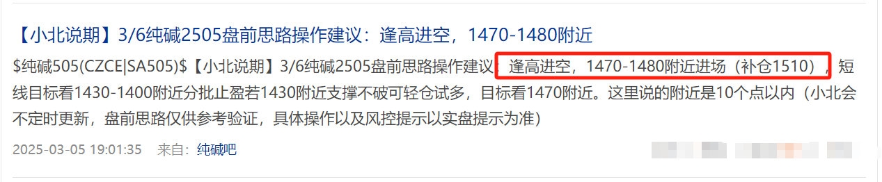 $纯碱505(CZCE|SA505)$ 纯碱空单兑现50点,3.6盘前给的思路是1470附近进场空单,随后市场行情发展符合预期,今日盘中纯碱价格最低下行至1416,完成利润兑现。(小北会不定时更新,盘前思路仅供参考验证,具体操作以及风控提示以实盘提示为准)