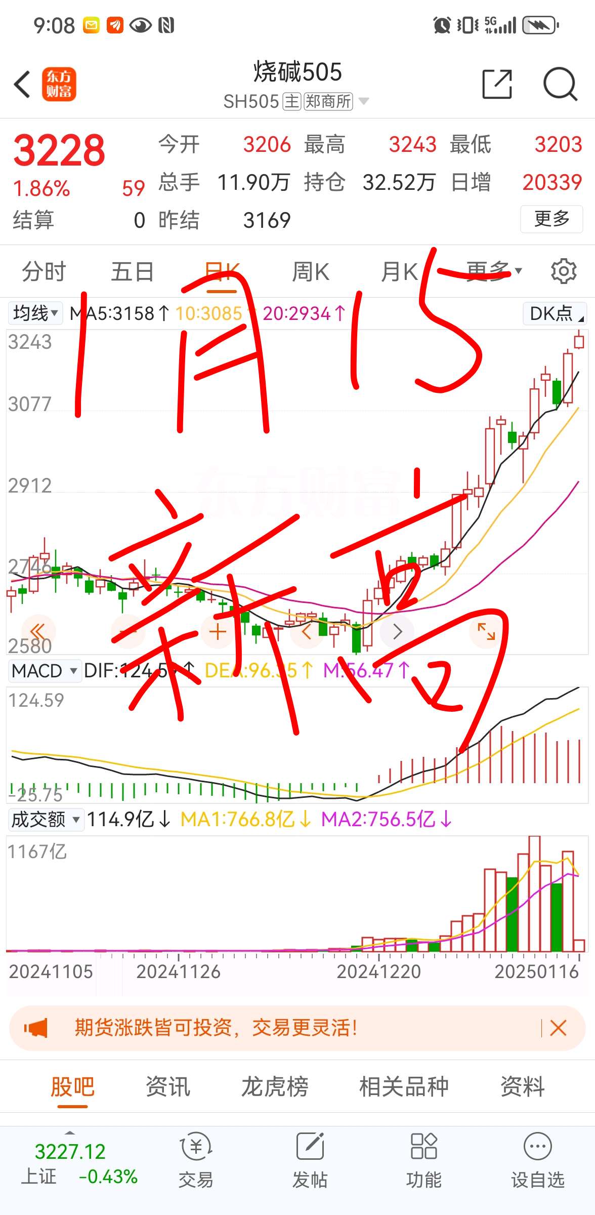 1月13日,烧碱505已过3100点,到顶了?别心急,这波要到你们都喊“烧碱金”。还是那句话,3500,我在春暖花开时来吃你。