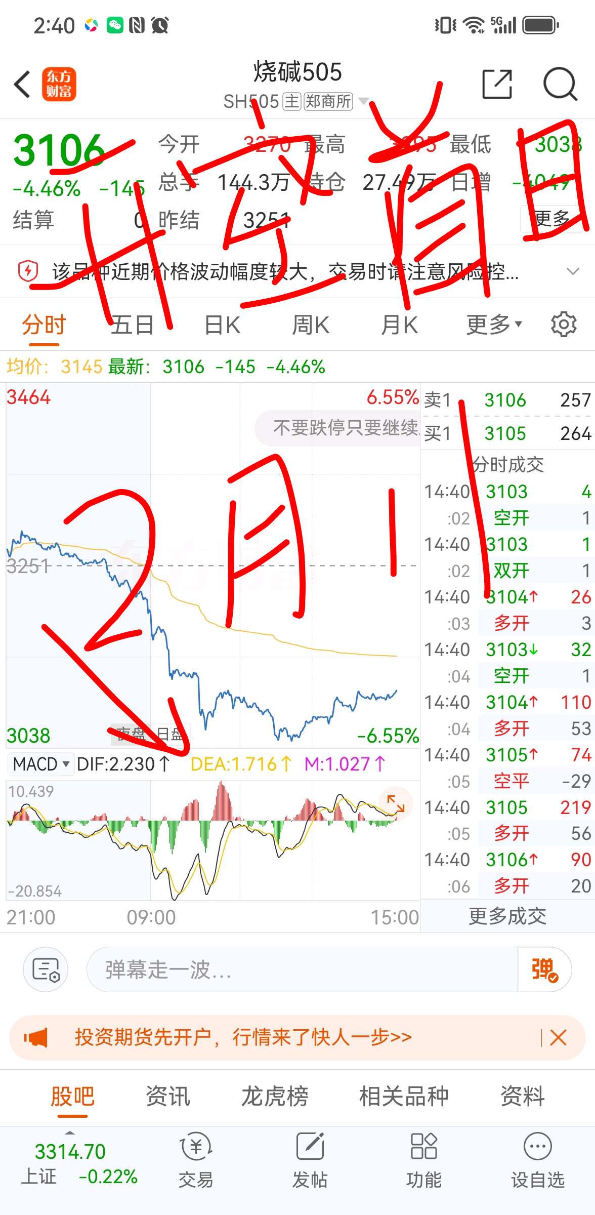 $烧碱505(CZCE|SH505)$ 烧碱主现在3088会干到3500。我会在春暖花开时,在那山顶上,开大空吃他500点。立帖为证。