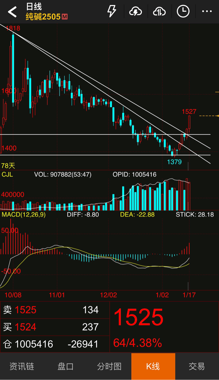 同样都是氯碱化工,同样都是用海盐提炼出来的低端化工产品,那么,现在按今天上午11:30收盘价,烧碱3236点,纯碱1525点,3236-1525=价差1711点。
