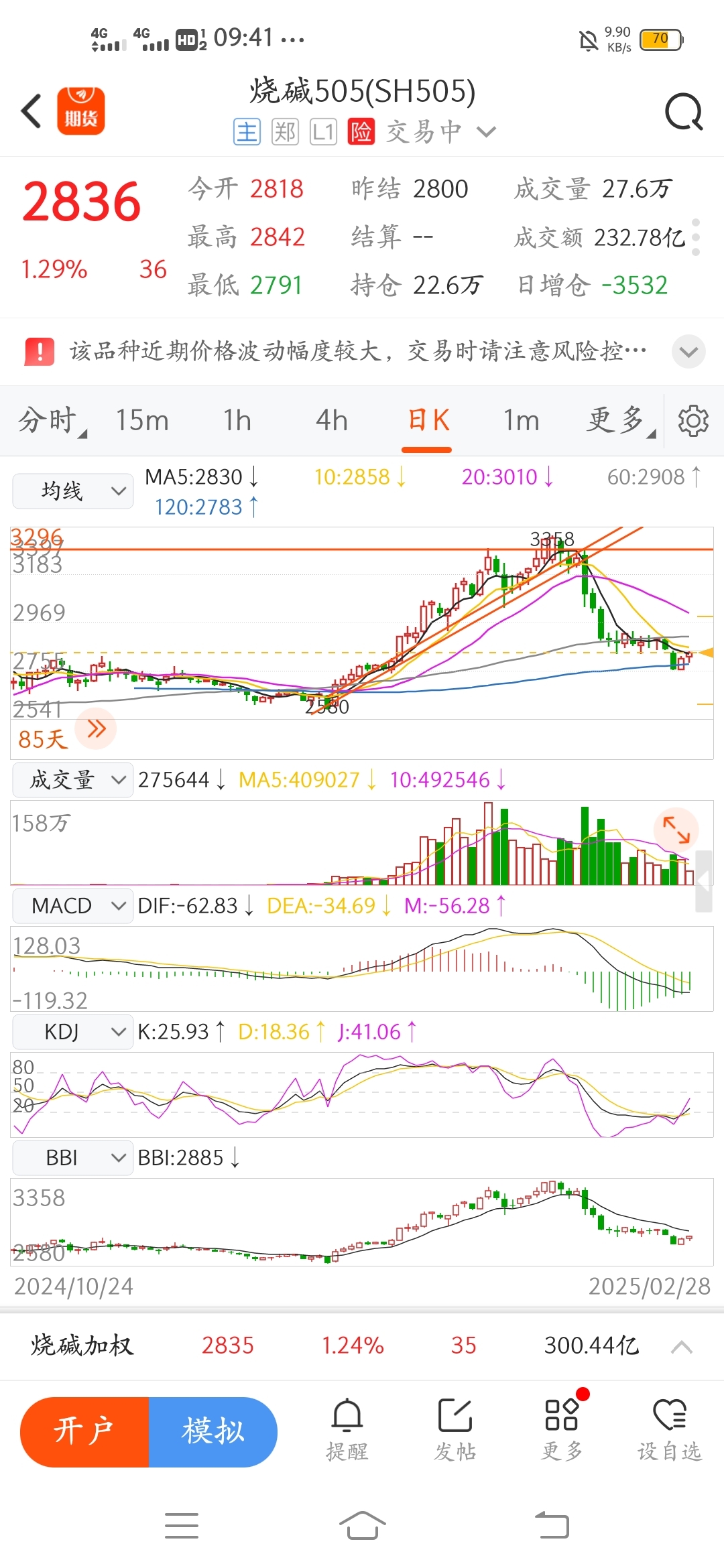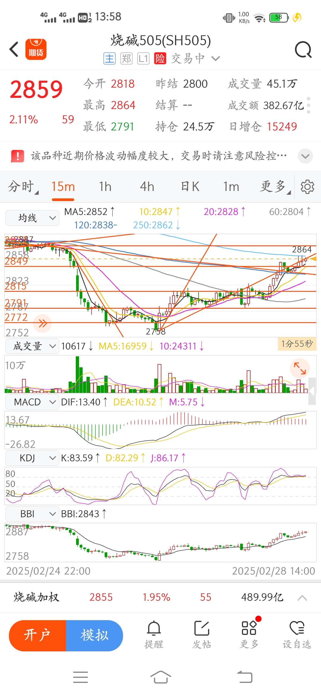 截止下午2点附近,烧碱来到2860附近,压力与支撑相互转化,上不去是压力,上去了就是支撑,记得灵活一点。