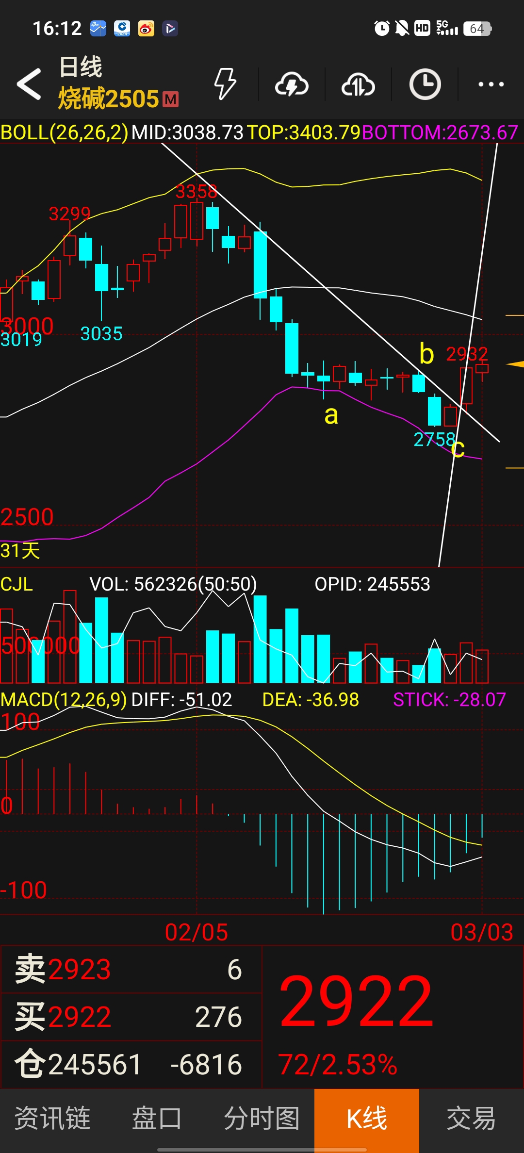 $烧碱505(CZCE|SH505)$ 烧碱5月合约经过一轮 abc下杀后已结束本波下跌浪,收盘突破下降趋势线,我宣布自2758发动第一波上涨浪,目标20天线,耐心等待拉回找买点,预期朱莉之预期让朱莉先动我后发制人,这就是顶级阳谋,他强任他强清风拂山岗它横归它横明月照大江