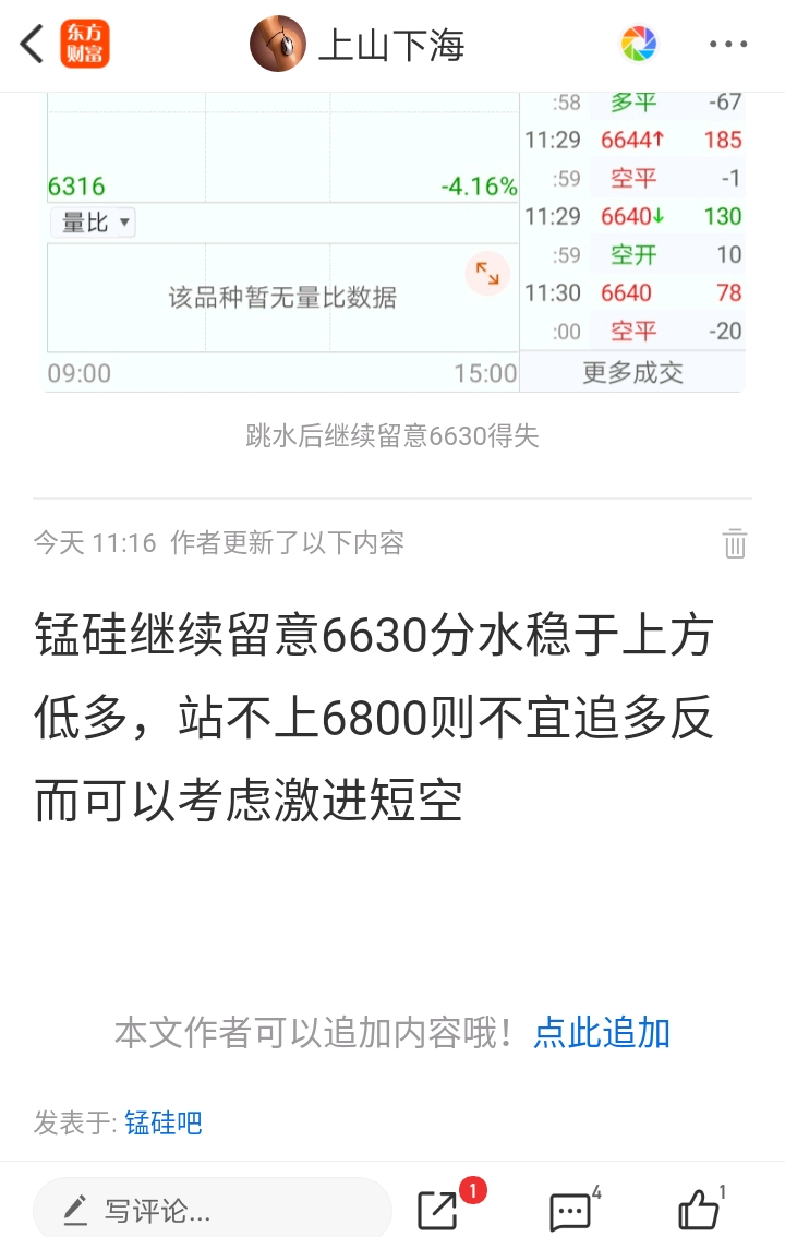 下周重点看锰硅6800是冲高回落还是稳住该位,稳则继续多,回落则注意短空。