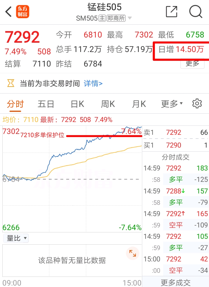 下午继续猛烈增仓超14万手,我的多单保护位由上午设的7070大幅上抬至7210高于该位则继续持仓,低于该位则主动止盈离场。周五明天继续留意持仓变化。
