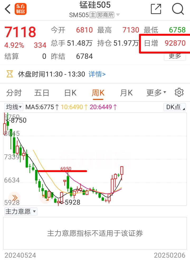 $锰硅505(CZCE|SM505)$ 锰硅领涨黑色系,今天上午大幅增仓突破去年10月高点平台6950后向上加速。由于春节没有留锰硅的单,所以今天还是在6910追多进去押注突破6950,目前止盈保护位我设置在7070高于该位则继续拿,但若低于7070则会主动止盈离场。接下来注意持仓变化。若继续增仓强势延续,但若冲高减仓则多单就要防反复。