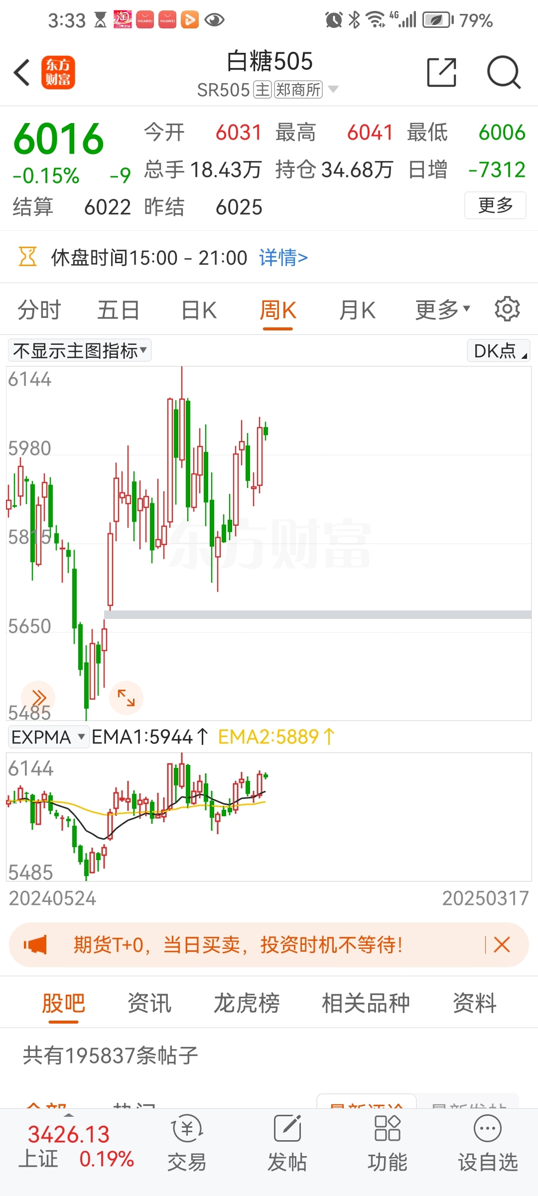 $白糖505(CZCE|SR505)$ 白糖近几天走势只是反弹,下跌的趋势并未改变,目标价5500元,从日线周线月线趋势看,均处于高位。从目前的盈利看,我对方向的判断是正确的,对趋势的判断也是正确的。