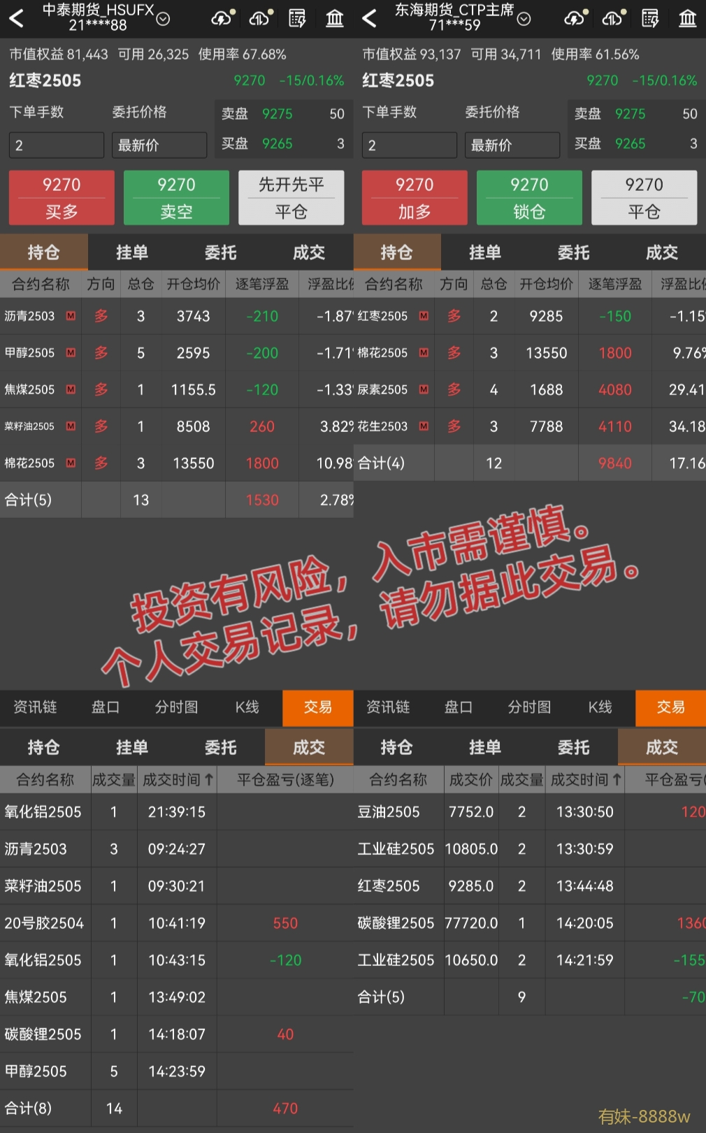 今日账户分别盈亏:-1737元,-5039元
