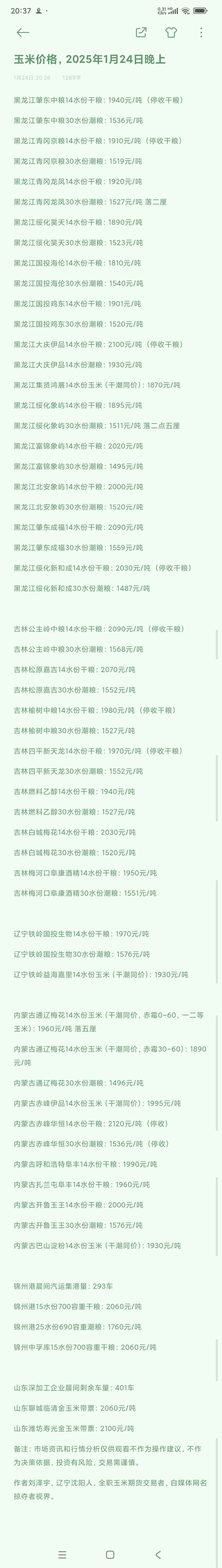【玉米期货】1月24日,夜盘期间现货价格无变动。