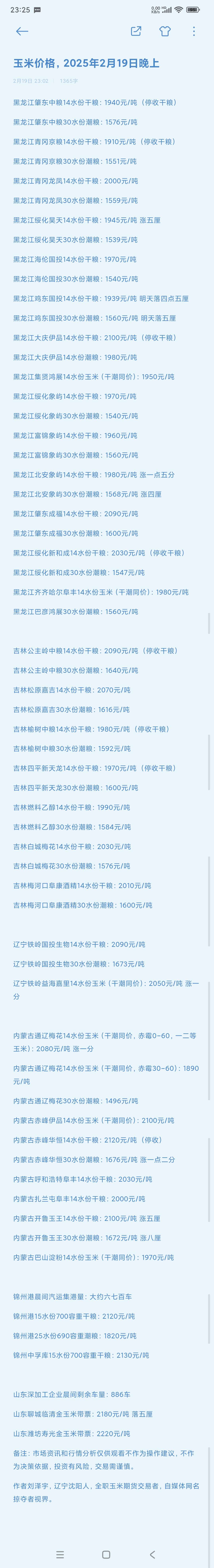 【玉米期货】2月19日,夜盘期间黑龙江鸡东国投通知明天落五厘,山东地区涨价企业增