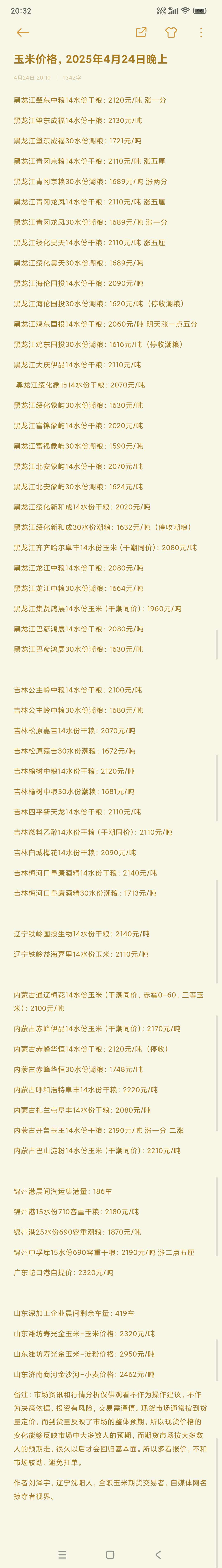 【玉米期货】4月24日,夜盘期间现货价格无变动。去年就是五六月份农民卖完了换贸易