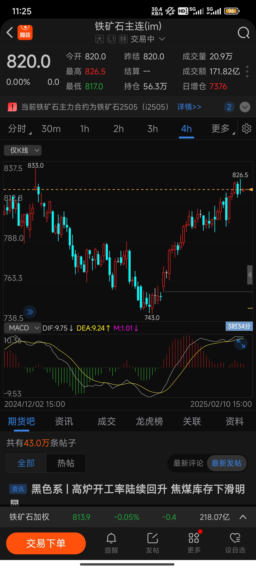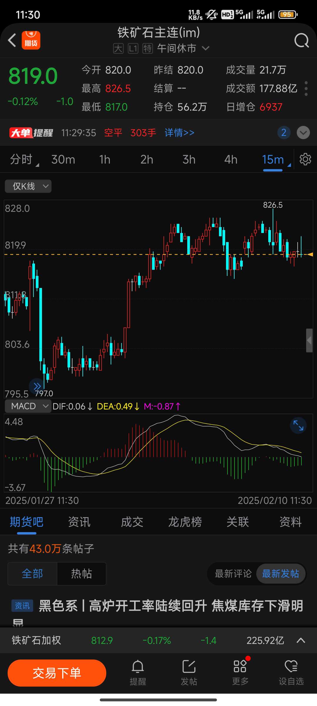$铁矿石主连(DCE|im)$ 820空,收盘在819以下再加空