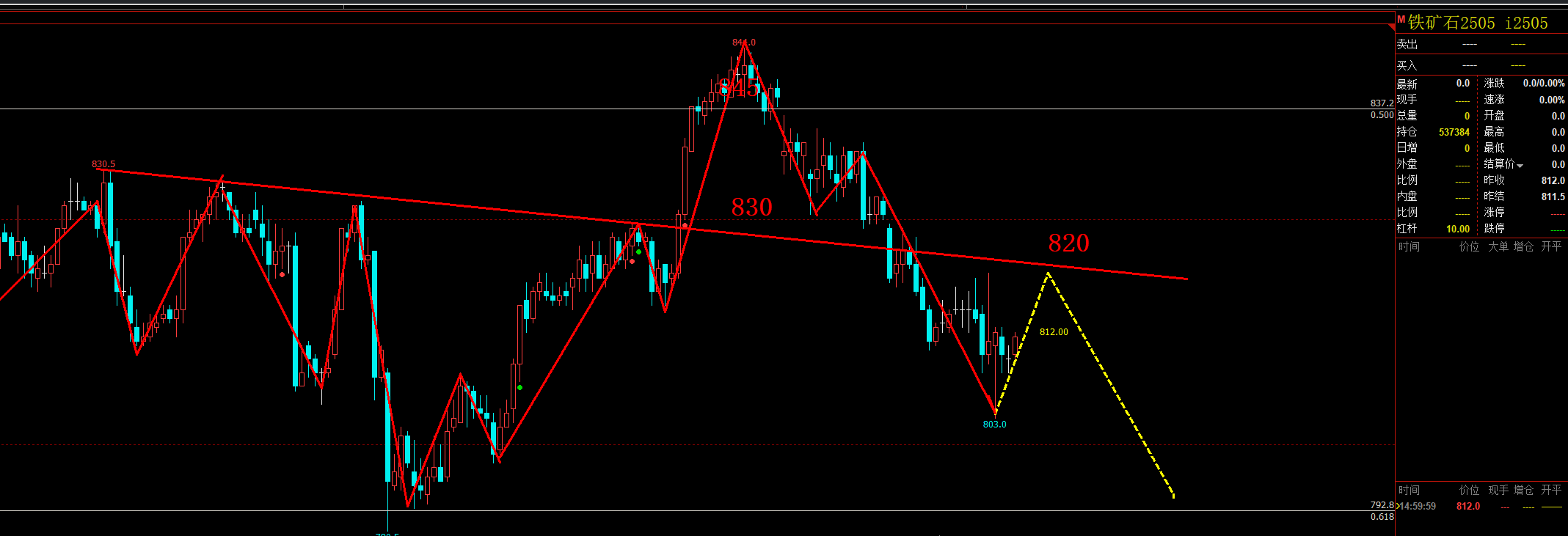 铁矿石2505:30分钟形成了头肩顶,晚盘看反弹颈线的压力820这里,下方支撑继续看800,其次是790,暂时继续看反弹空。