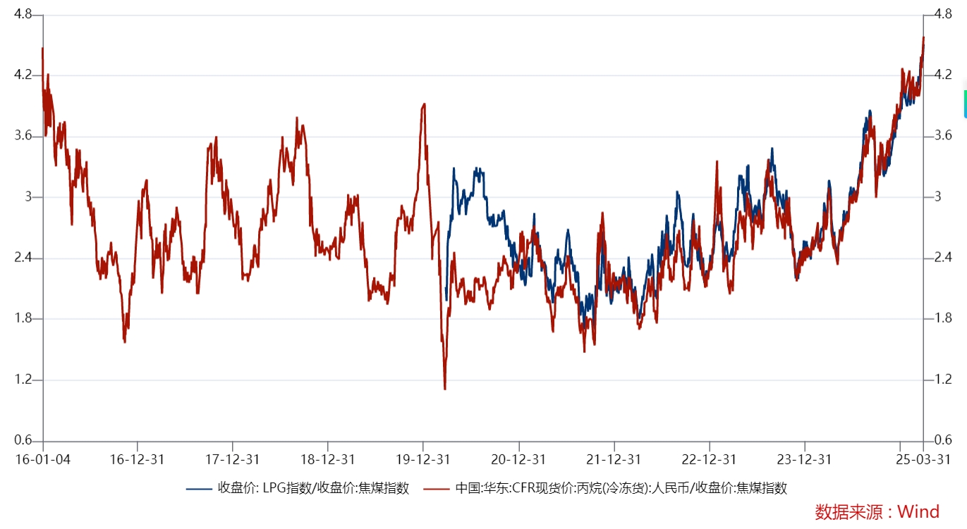 下图是近十年以来,LPG(液化石油气)和焦煤的历史价格比(包括现货和期货)。两者都是作为国内的工业和民用燃料,价格比稳定在1.4~4.2之间,差不多每半年出现一轮强弱切换。
