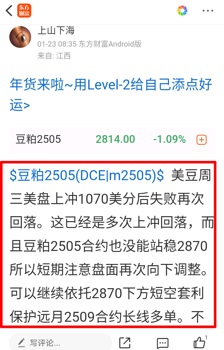 $豆粕2505(DCE|m2505)$ 本周美豆在周三上冲1070上方失败后震荡回落,两粕也跟随回落。目前空2505合约保护远月2509合约长线多单参与中。节前下周最后交易结点关注豆粕2505合约2820分水以下则继续调整但若又站上2820则空单不追。