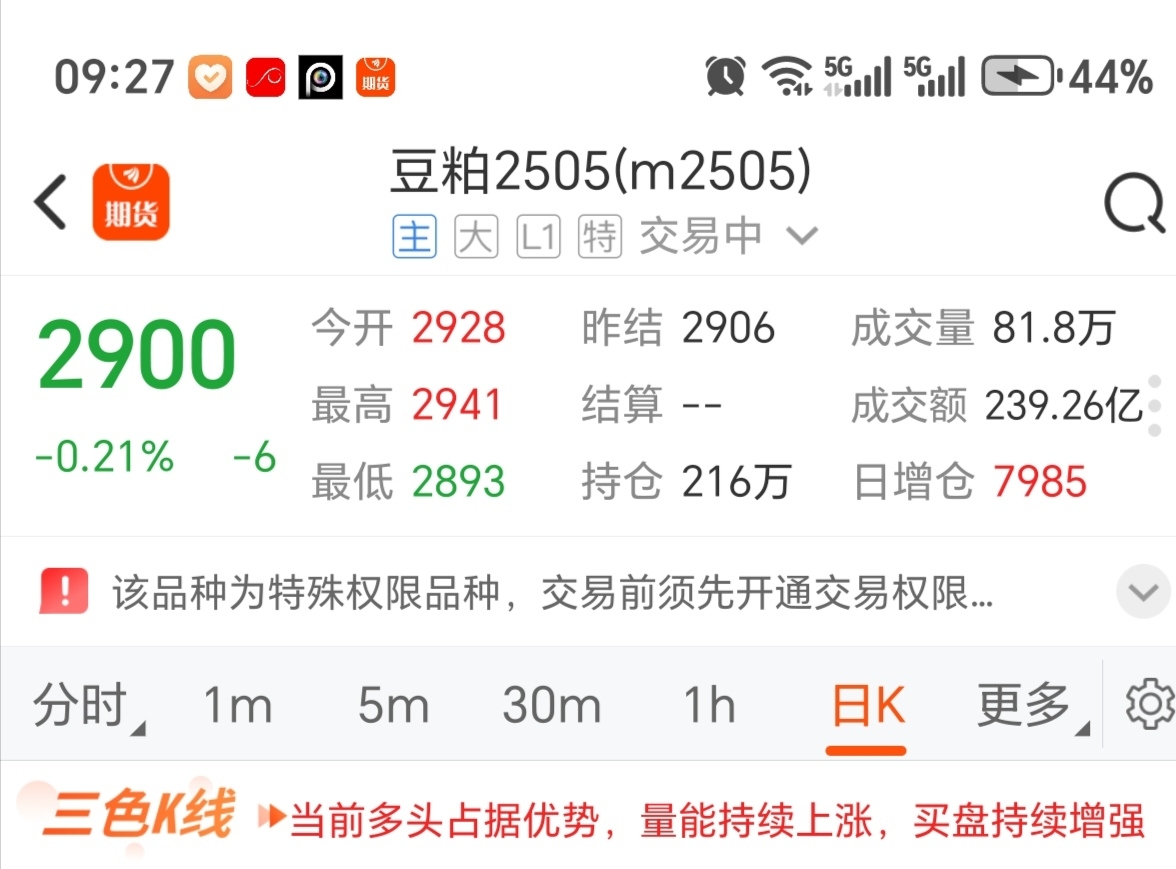 $豆粕2505(DCE|m2505)$ 豆粕可以继续进多,看到2970,第二目标3020,