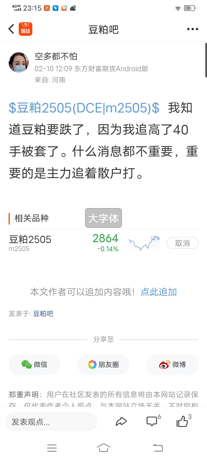 $豆粕2505(DCE|m2505)$ 有人问我成本多少追的,有显示的,2月10号2940追多的40手。我会一直扛到2000。