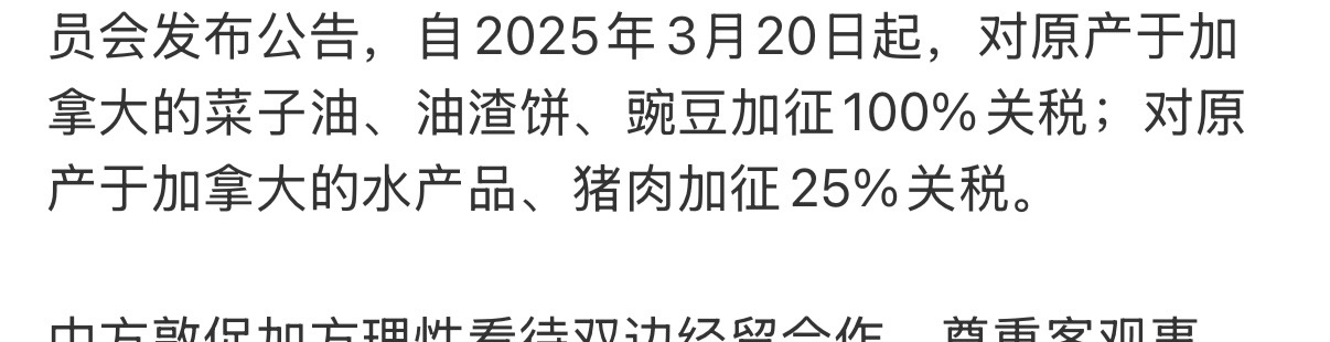 没对菜籽加税,对菜籽油和油渣(进口基本可以忽略不计),无事发生,甚至可以算利空