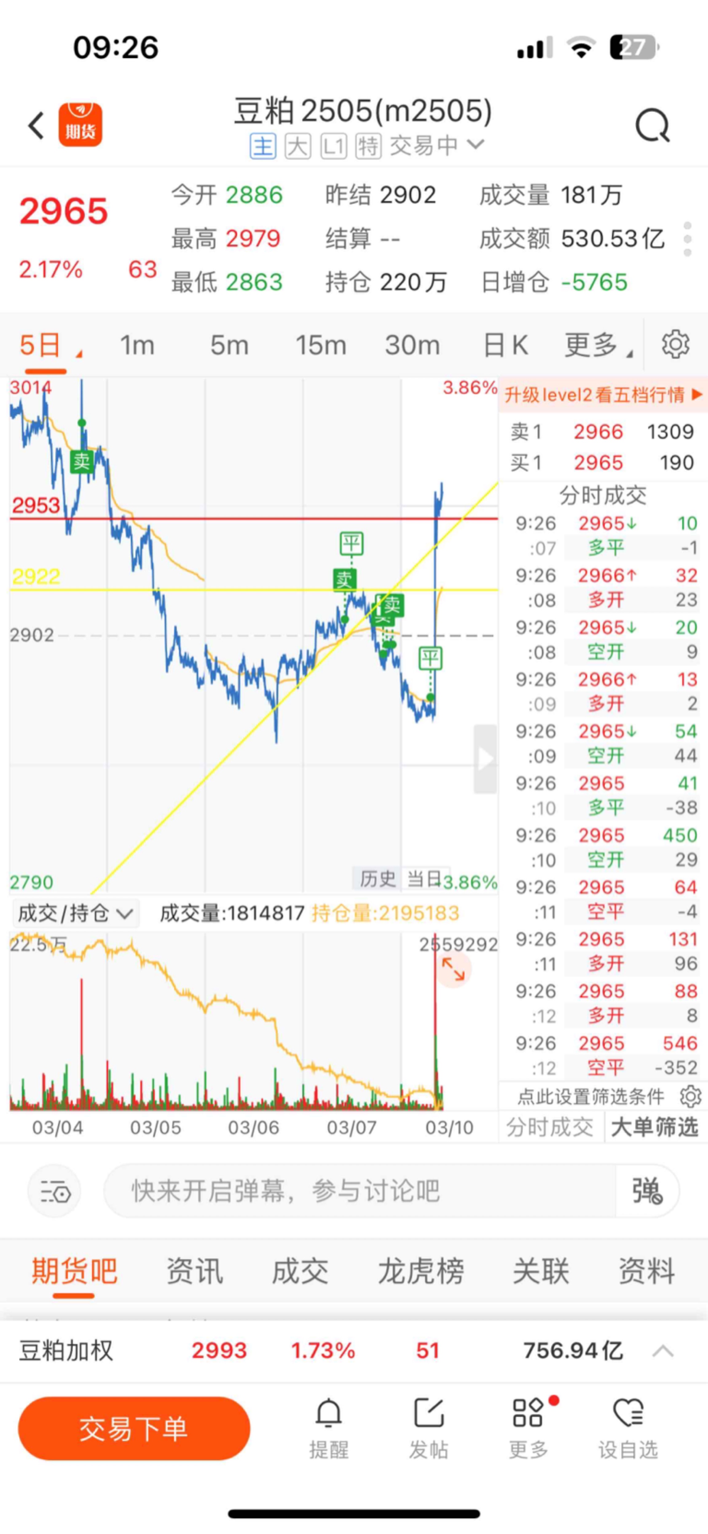 $豆粕2505(DCE|m2505)$ 只能说 菜 还想着今早找机会多 没想到根本不给机会啊