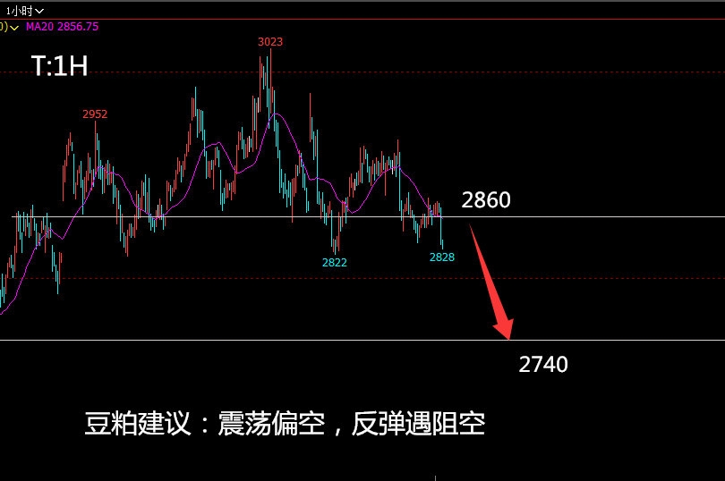 豆粕2505:豆粕自高位震荡回撤,短期走势偏空运行,后续行情有持续下探之势,布局上高位空为主。操作建议,豆粕回升测试2860一线遇阻不破可进场空单,目标看下方2740一线,损30个点。