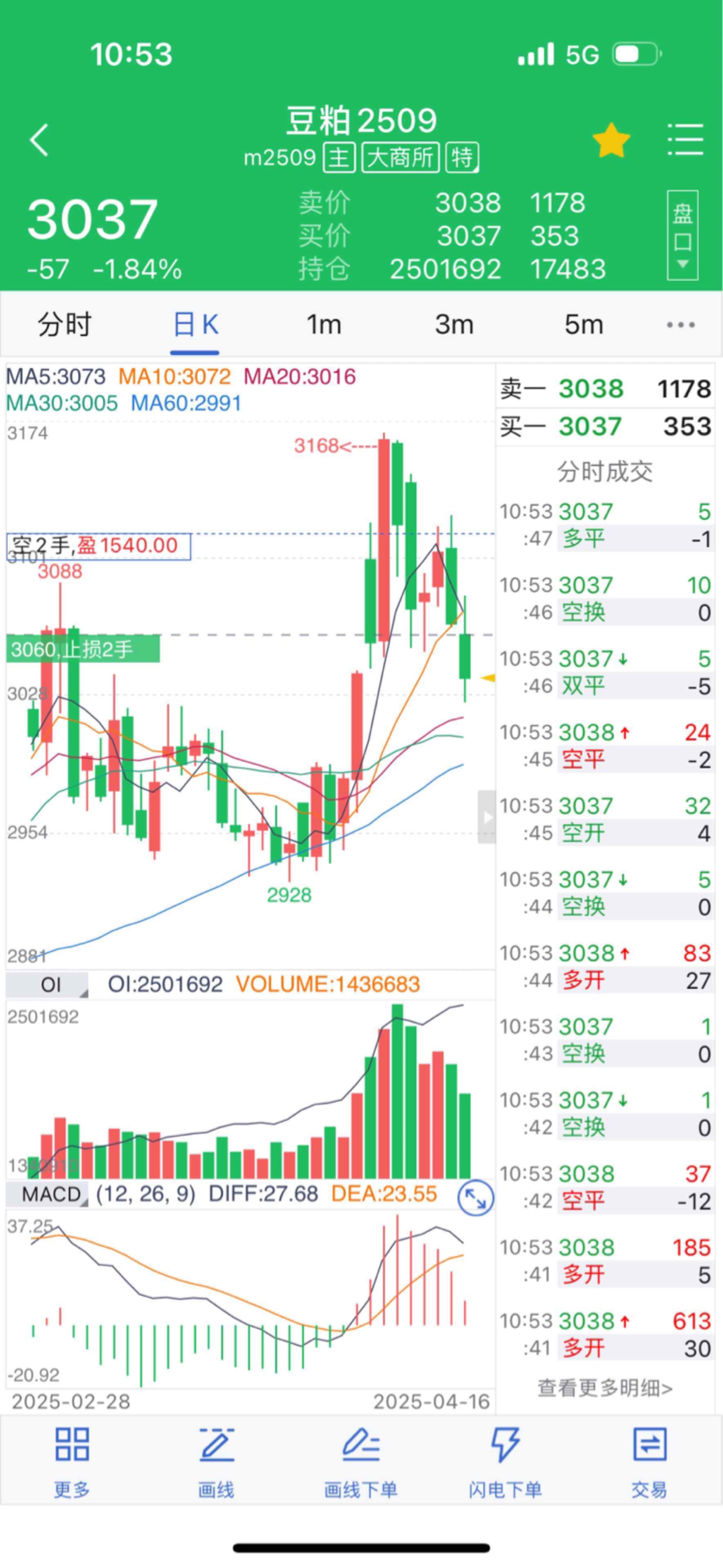 $豆粕2509(DCE|m2509)$ 继续下调移动止损到 3060