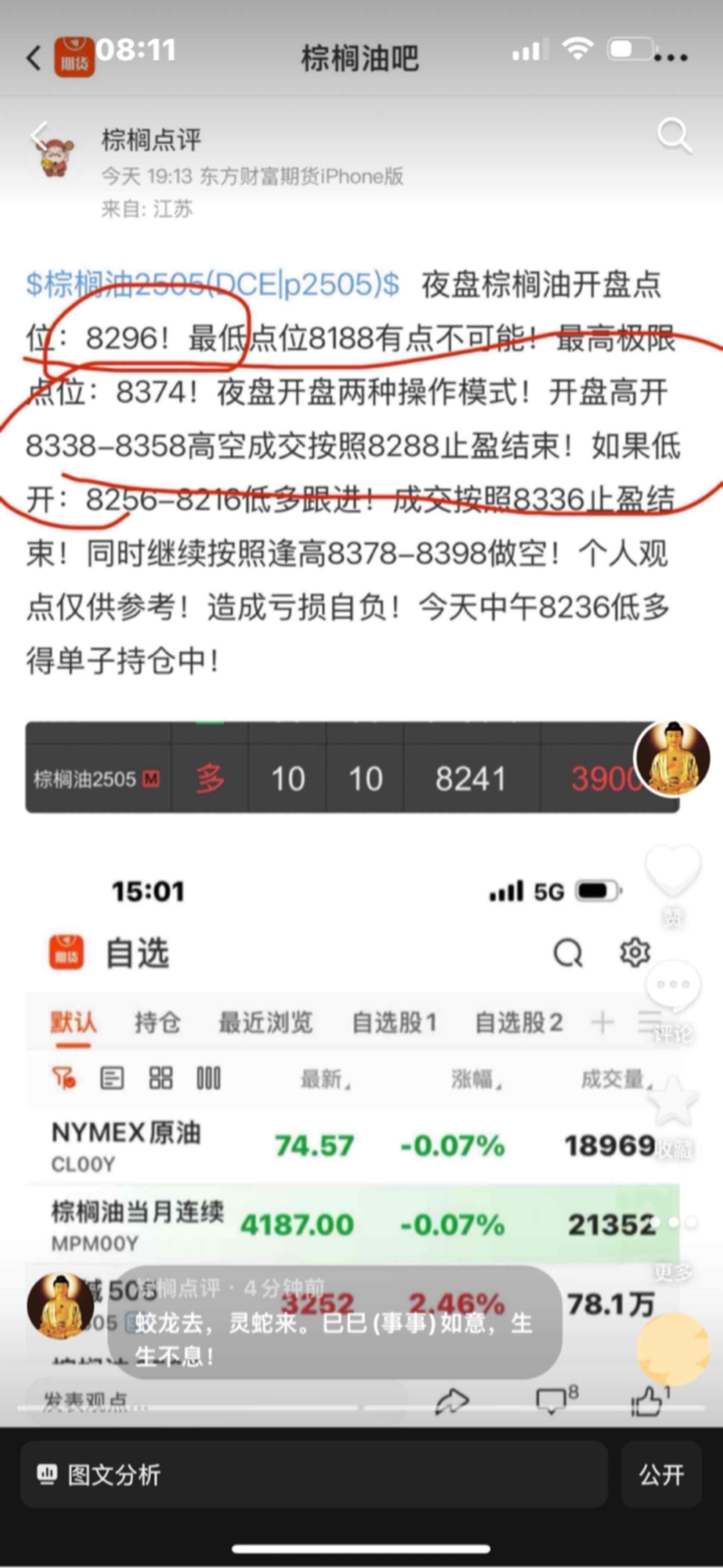 $棕榈油2505(DCE|p2505)$ 棕榈油预测还是有点给力的!8398也有可能要成交!切记赚钱就出!最好还是空仓过节!