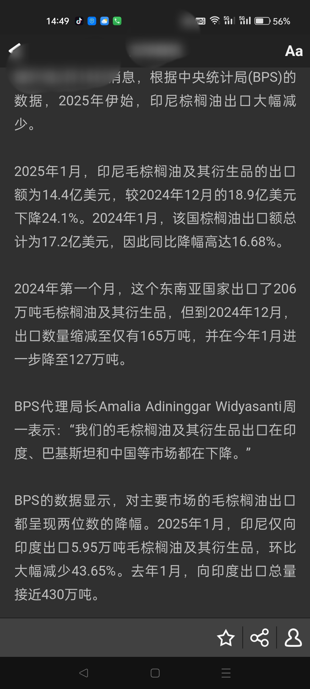 $棕榈油2505(DCE|p2505)$ 印尼完蛋了。一月出口下滑同比下滑百分之四十。金额下滑百分之二十。意思国内库存越来越高。还要给更高的补贴。出口金额越来越少收的税越来越少。他的b40真不知道钱从哪来来补贴。注定破产。