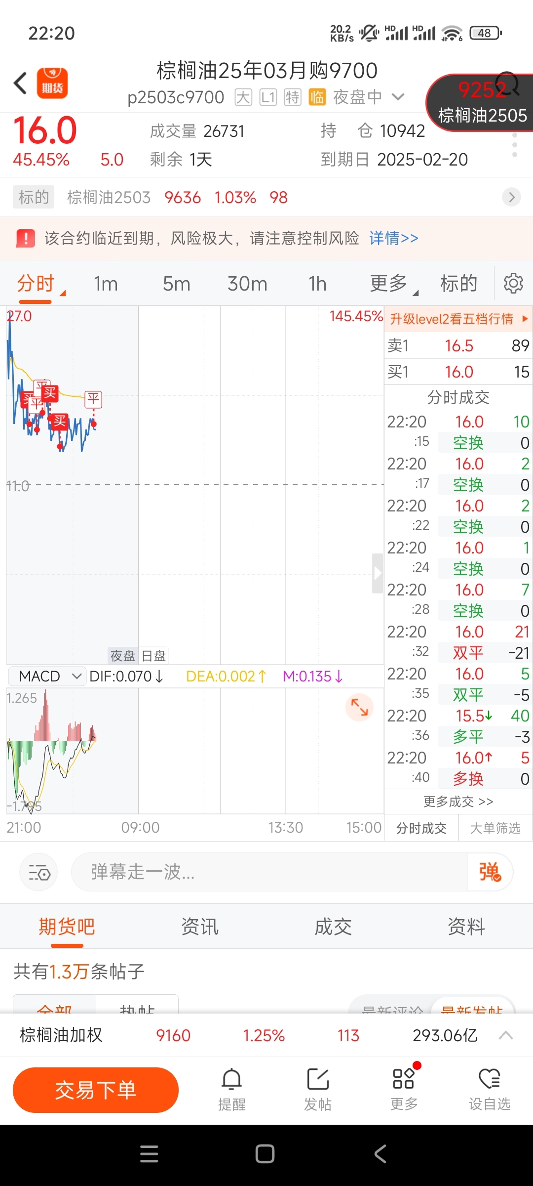 $棕榈油2505(DCE|p2505)$ 不敢要是一会跳水这玩意得跌多少,涨了20个点,还在16徘徊