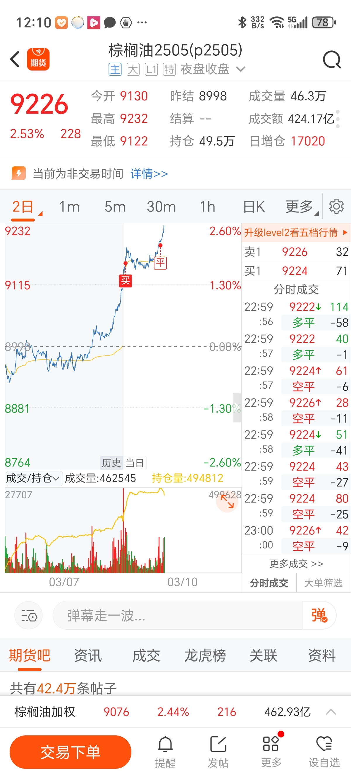 $棕榈油2505(DCE|p2505)$ 看来平早了,明天再买回来,这个爆发力这么早,为了赶顶,先买多,等多了亏的厉害了全仓做空