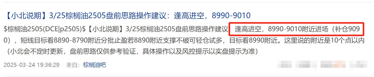 棕榈油空单兑现190点,3.25盘前给的思路是9010附近进场空单,随后市场行情
