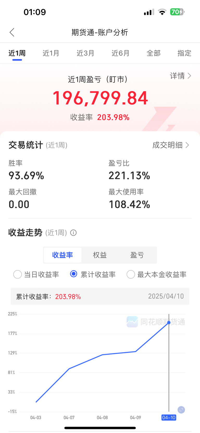 $棕榈油2505(DCE|p2505)$ 分享一下历程经验:清明放假前,看到原油72,已经有点暴跌前的拉爆空头的味道,坚持持有燃油和油脂的空单,这个账户10万本金,这周翻了接近2倍。对国际行情的了解,感谢自己看法的坚持。心得建议:大家不要一开始就满仓,也不要逆势加仓,达到目的减仓,底仓留住,心态就好一些,总有一天会返璞归真,到达自己的理想彼岸。共勉!