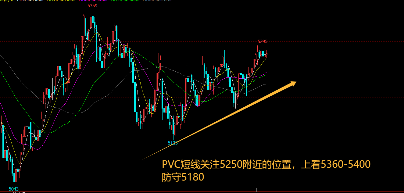 $PVC2505(DCE|v2505)$ PVC05合约:PVC近期反弹逐步突破,站稳了5280这个位置,有一定的企稳迹象,并且重心也在逐步抬高,有继续冲高的意思,建议短线可以低多参与一波,短线关注5250附近的位置,上看5360-5400,防守5180(投资建议 仅供参考 具体以实盘操作为主)
